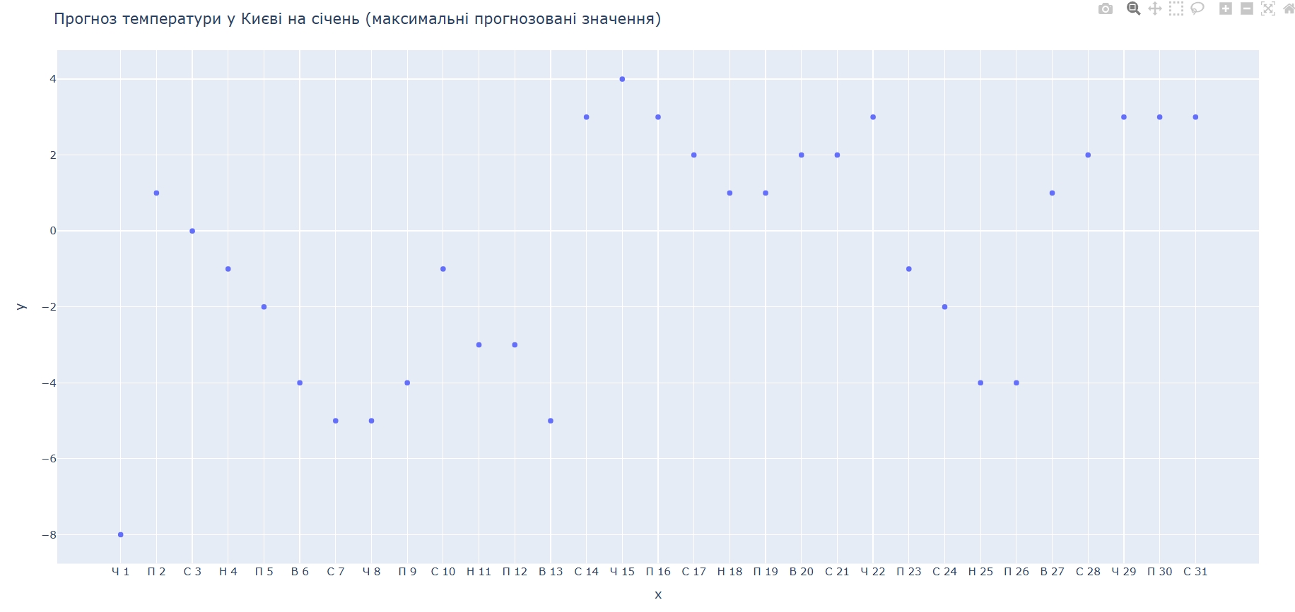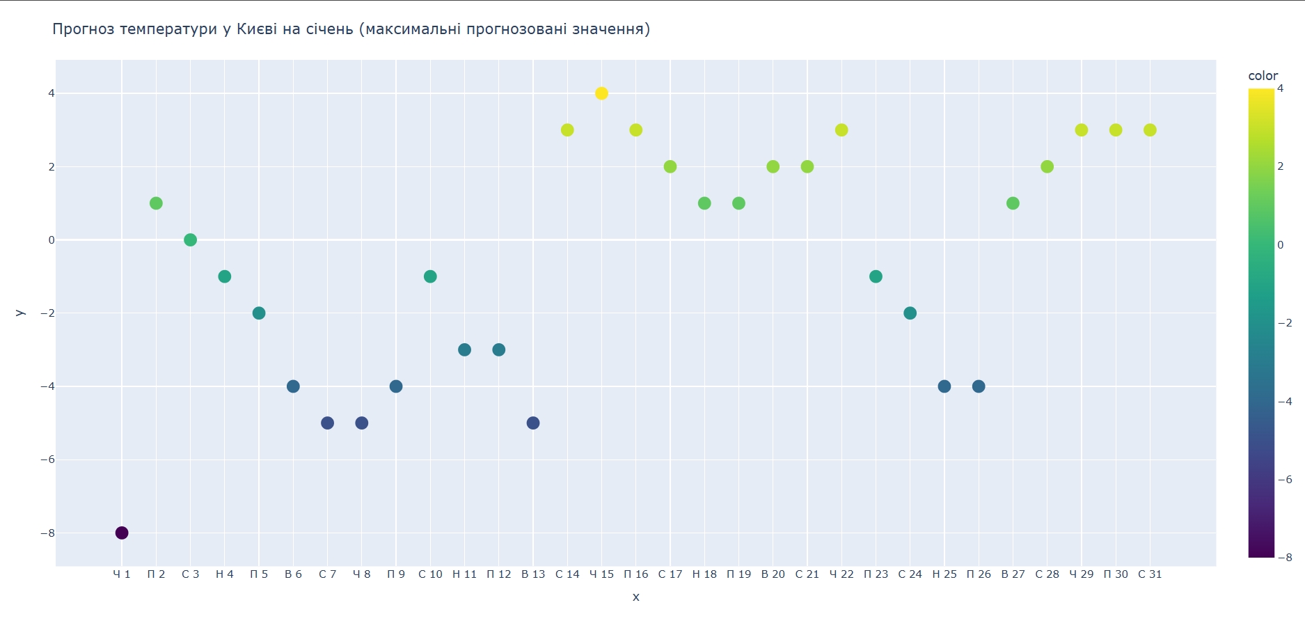 scatter_plot.update_layout(title="Прогноз температури у Києві на січень (максимальні прогнозовані значення)")Відображаємо графік:
