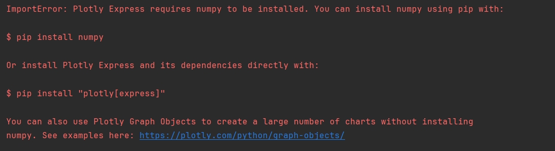 Після запуску попореднього коду ви, можливо, можете зіштовхнутися з деякими помилками, які буде відображати ваш код. Це пов’язано із пакетом express бібліотеки plotly. Справа у тому, що для коректної роботи цього пакета треба, щоб ви завантажили декілька інших бібліотек.