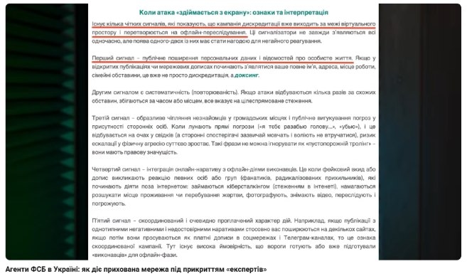 В статті вона ж так жалілася: “Існує кілька чітких сигналів, які показують, що компанія дискредитації вже виходить за межі віртуального простору і перетворюється на офлайн переслідування. Перший сигнал- публічне поширення персональних даних і відомостей про особисте життя”.