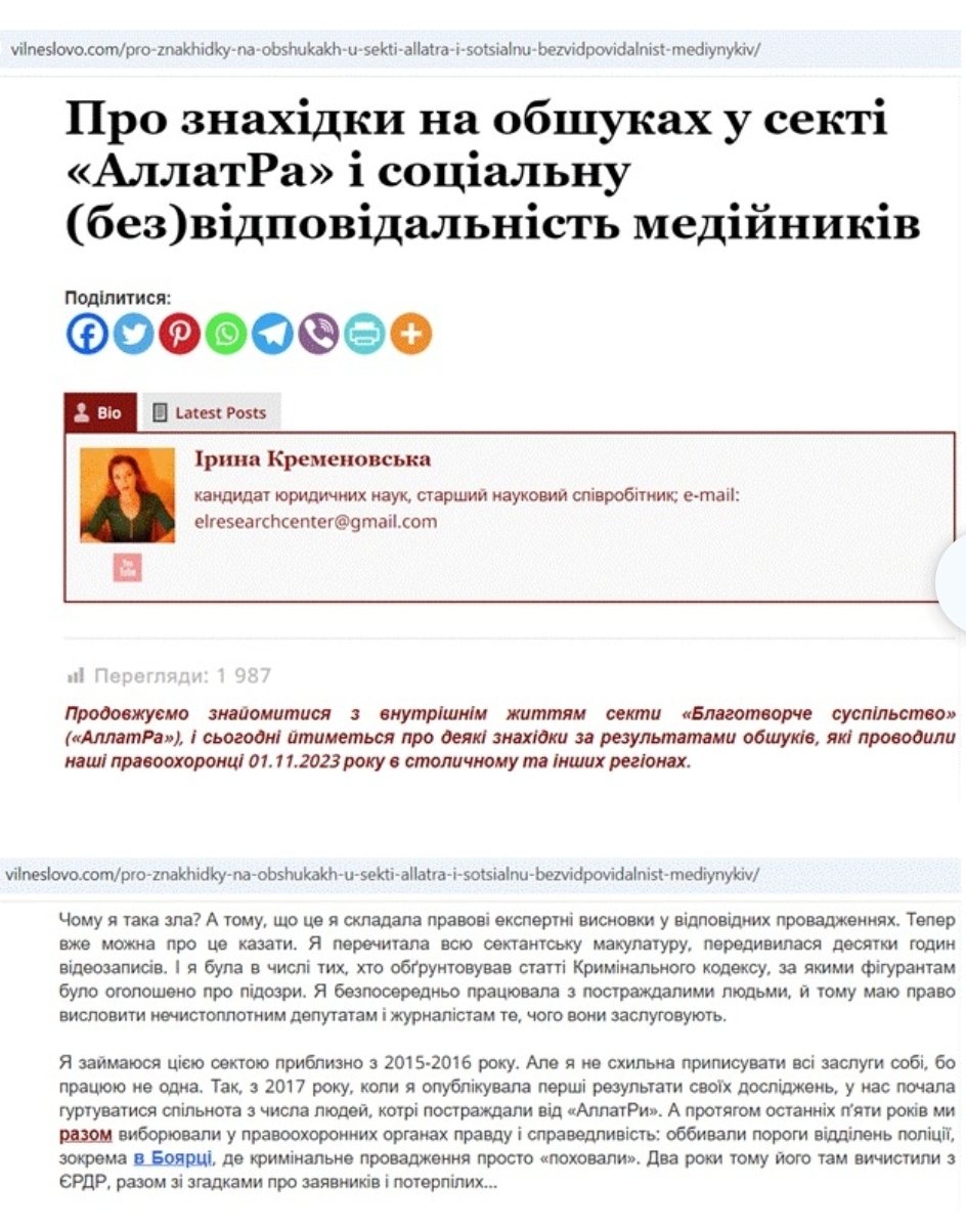 Кременовська сама пише «експертні висновки», посилається на таких же псевдоекспертів і сама подає до суду.