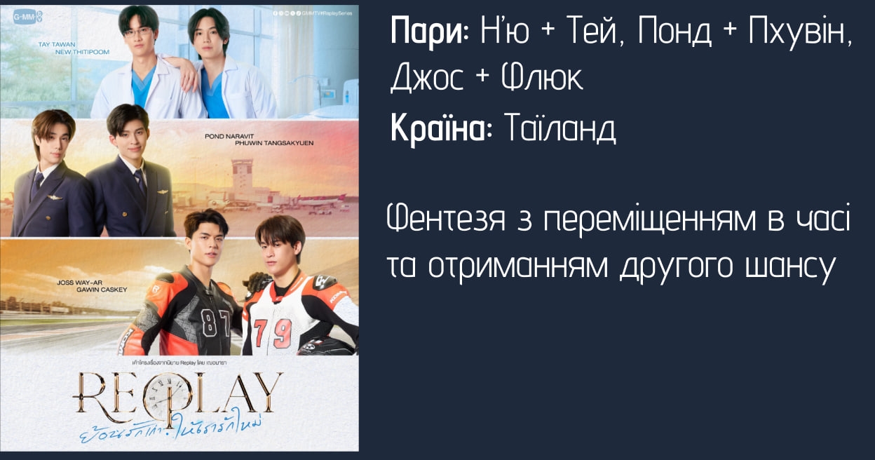 REPLAY | Н’ю + Тей, Понд + Пхувін, Джос + Флюк | Фентезя з переміщенням в часі та отриманням другого шансу | Серіал чи то скасовано, чи то призупинено (чому - можна дізнатись тут) |