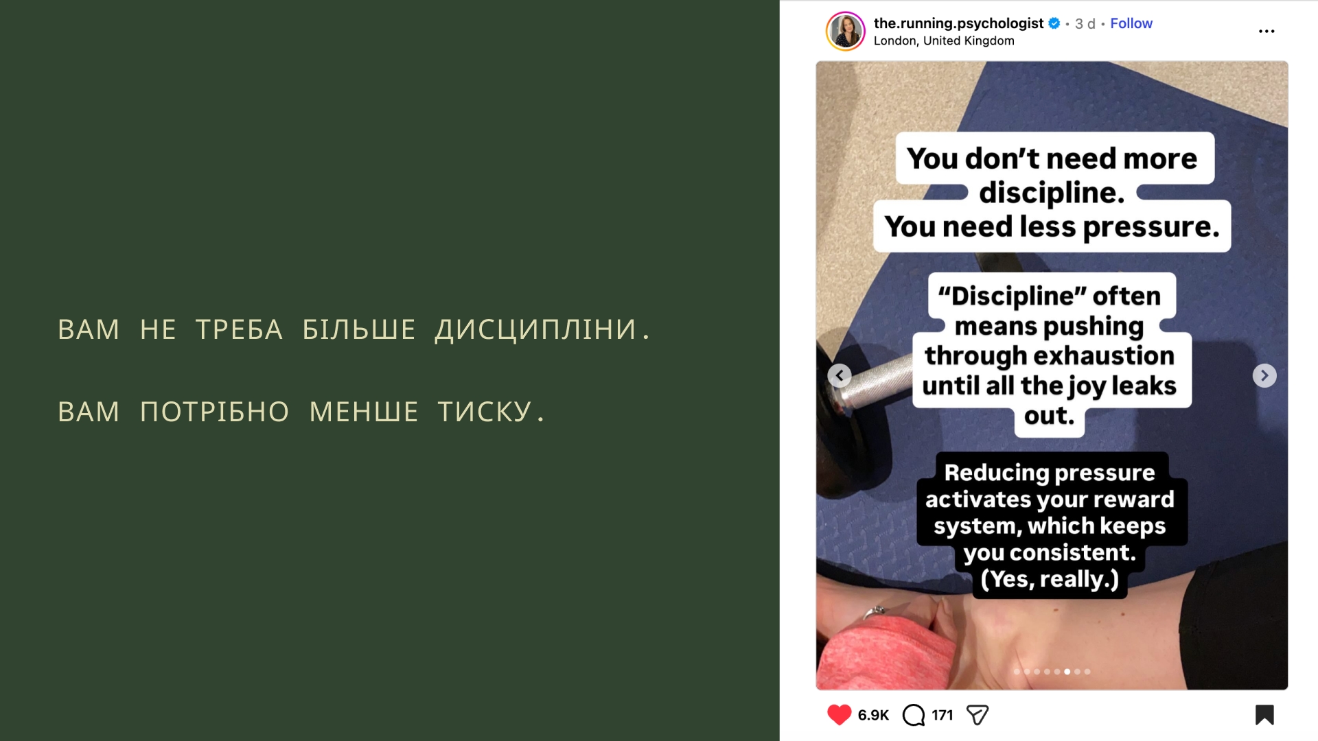 Мабуть, головне відкриття цього року — я не мушу щоразу починати з нуля (з понеділка, з Нового року чи коли куплю нові кросівки). Сьогодні вранці, після двотижневої перерви, я зробила йогу — і цього вже достатньо, щоб похвалити себе.