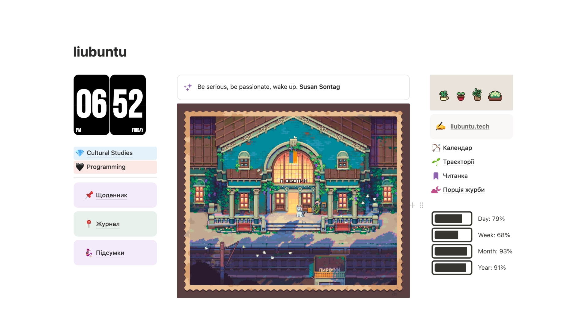 Я почала користуватися платформою влітку 2024 року, щоби навести лад в ресурсах з програмування. За пару місяців мій Notion розрісся в розгалужену, проте елегантну систему, яка охопила мої захоплення, фриланс і шитпостинг в блускай.