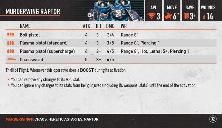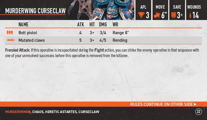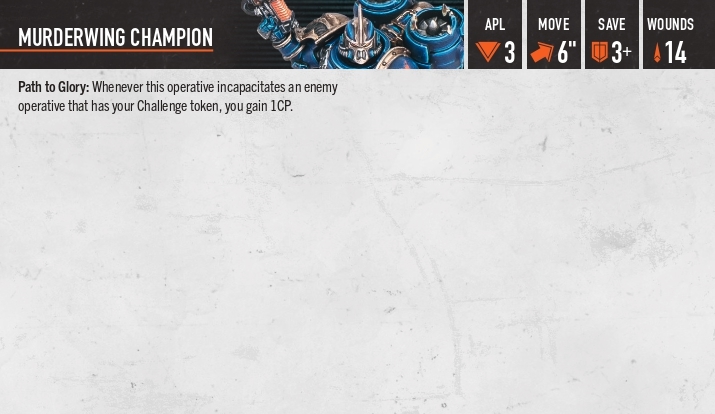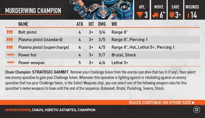Chaos champion: даємо вибраному оперативнику токен челенджу, або перевішуємо його з когось на когось. Коли ми цим оперативником б’ємося або відбиваємося від оперативника з таким жетоном ми можемо видати нашій зброї одне з правил: балансед, брутал, панішінг, севір, шок.