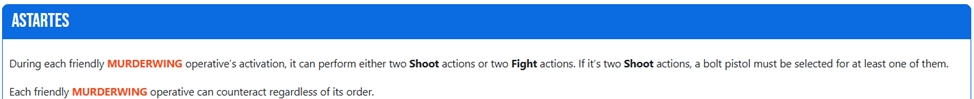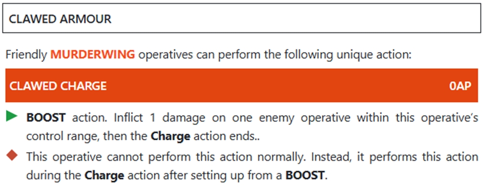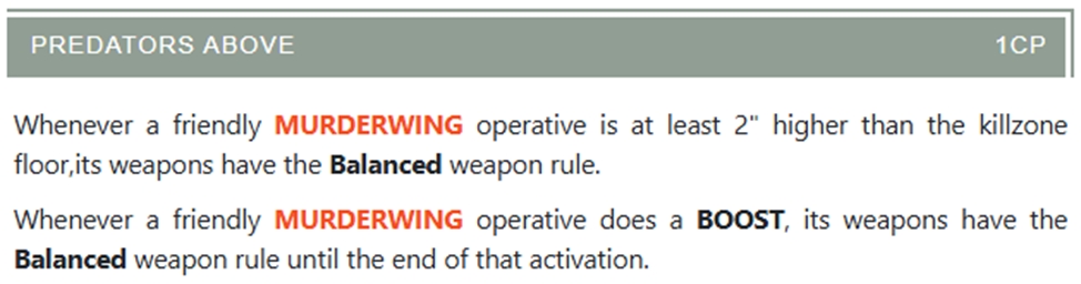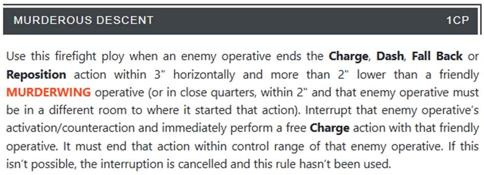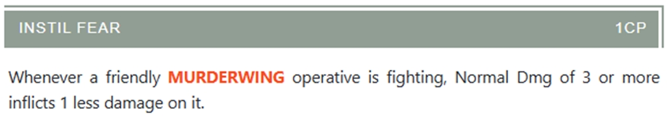 Один раз за хід, один наш оперативник може зробити спеціальну дію за й апл. Для неї всі ворожі оперативники в 3” від нашого оперативника проходять стан тест: кидають 1Д6 і на 3+ ми забираємо 1 апл до кінця їхньої наступної активації.