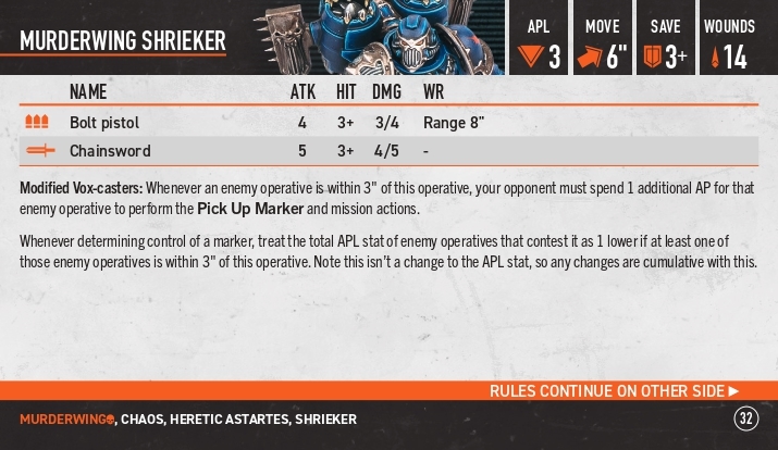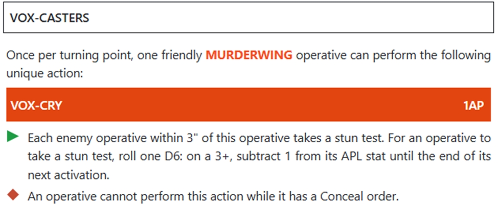 Modified vox-caster: коли ворог знаходиться в 3” від цього оперативника він має потратити на 1 апл більше для пік ап екшена або місійного екшена.
