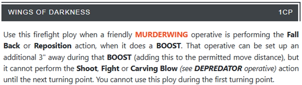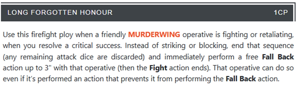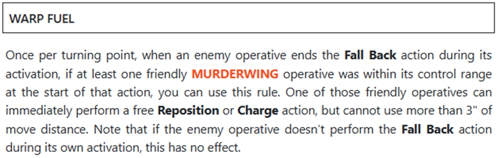 Pinned prey: коли ворог хоче зробити фолбек - ми кидаємо 1 (2, якщо якщо ворог має більшу вунд стату ніж ми) кубики, і якщо хоча б 1 значення 4+ то ворог не фолбекає. Дуже файна штука проти команд які можуть фолбекнути на реактивному муві (стелси ТАУ).
