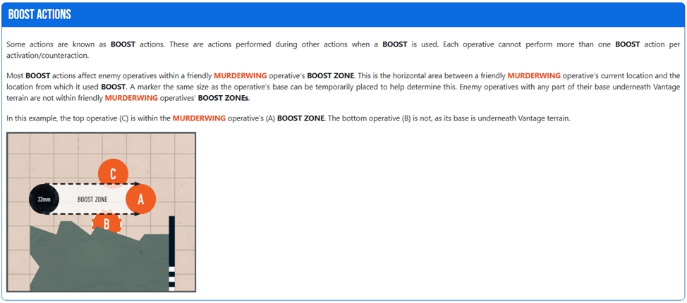 Коли ми робимо чарж, фолбек, репозішн під час активації коли ми рухаємося по прямій, якщо жодна частина нашої бази не під вантажкою - ми можемо зробити BOOST. Якщо ми це робимо - натомість ми телепортуємо фігурку на відстань нашого прямого переміщення. Відстань такого телепортування не може перевищувати те, на скільки ми можемо порухатися за відповідну дію. Тобто, якщо ми робимо репозішн, 1” щоби вийти з-під вантажки, далі напряму - то рухаємося не далі 5”, а сукупно - не далі 6”.