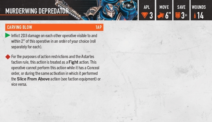 Carving Blow: наносимо кожному оперативнику (нашим в тому числі) в радіусі 2” від цієї моделі 2Д3 дамага (для кожного ролимо окремо).