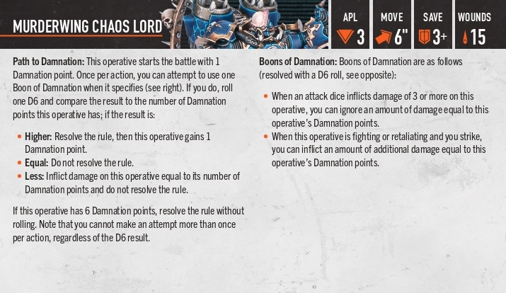 Path to damnation: оперативник стартує з 1 очком Damnation. Один раз за дію ми можемо використати boon of damnation як там написано. Для цього ми роляємо 1д6 і порівнюємо результат з кількість очок Damnation: