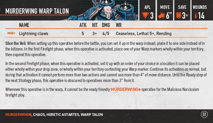 Slice the Veil: коли ми сетапимо тіму, бо цей оперативник сетапиться в стороні. Коли він активується на перший хід - натомість ми кладемо маркер варпу повністю на нашій території і експендимо цього оперативника.