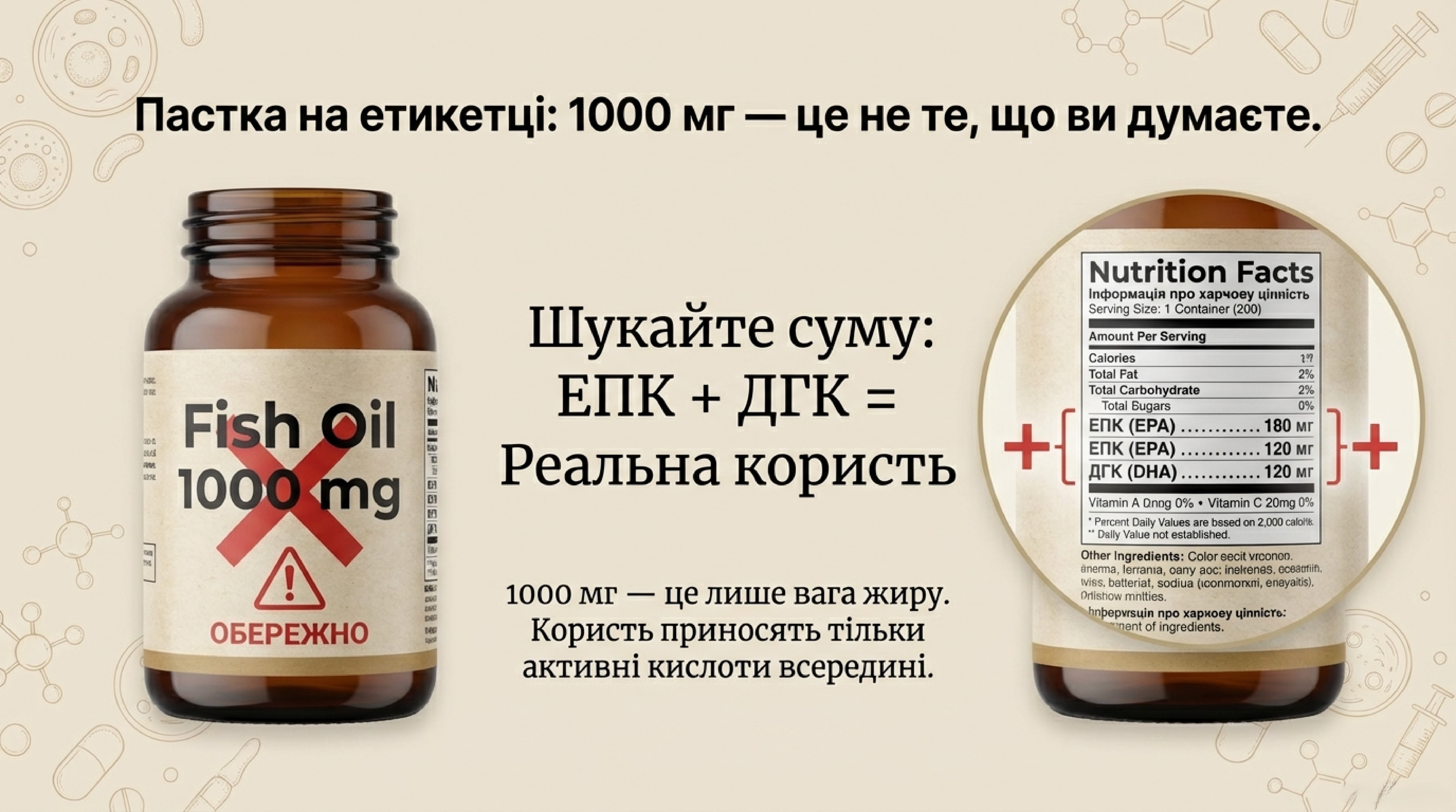 Напис «Fish Oil 1000 mg» на пакованні — це маркетингова пастка. Це загальна вага жиру в капсулі, проте вам потрібні лише дві конкретні кислоти: ЕПК та ДГК. Саме на їхню сумарну кількість слід звертати увагу в таблиці складу.