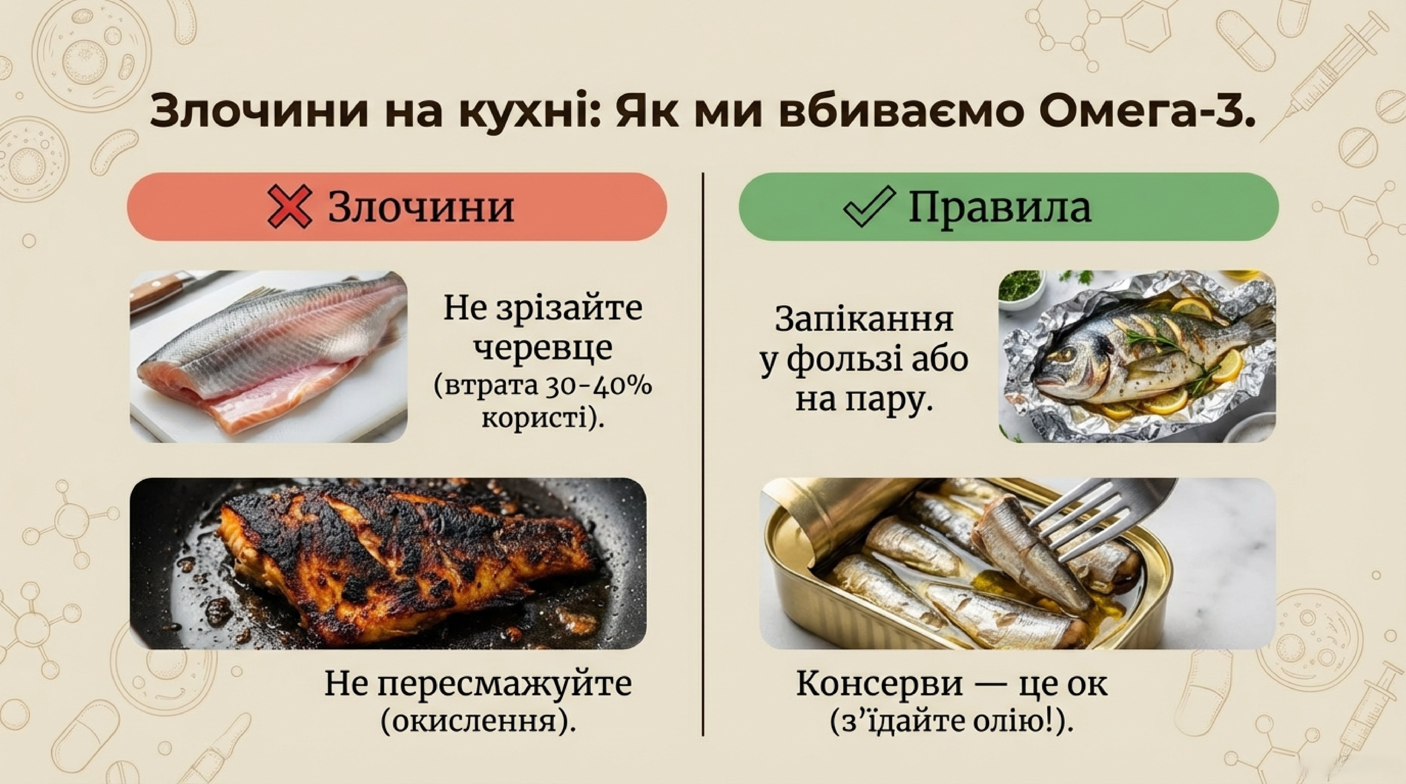 НЕ МАРНУЙТЕ НАЙЦІННІШЕ: основна концентрація омега-3 зосереджена під шкірою та в черевці риби. Якщо ви зрізаєте жирне черевце або чистите рибу до «ідеального філе» без шкіри — ви втрачаєте 30–40% користі.