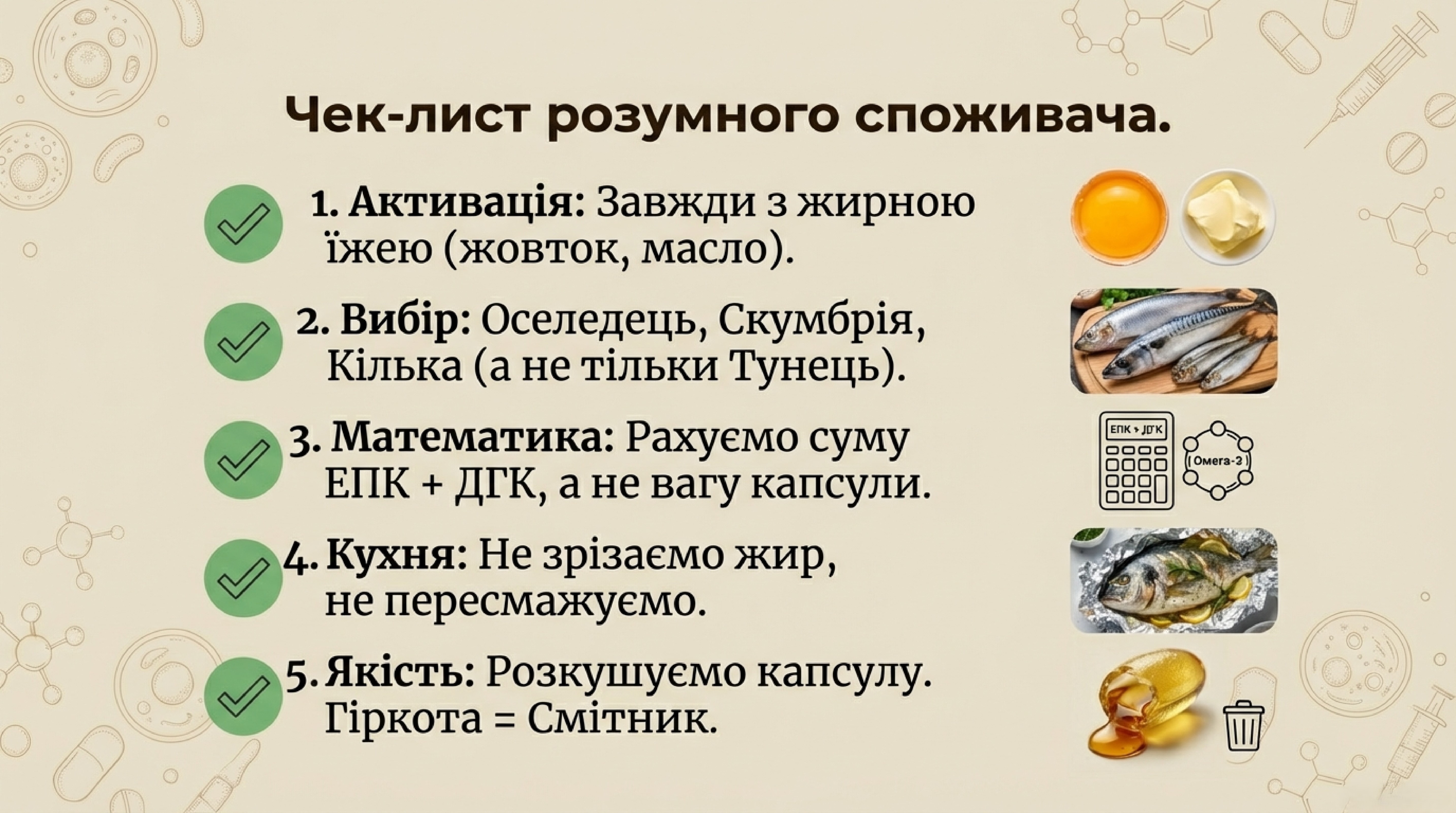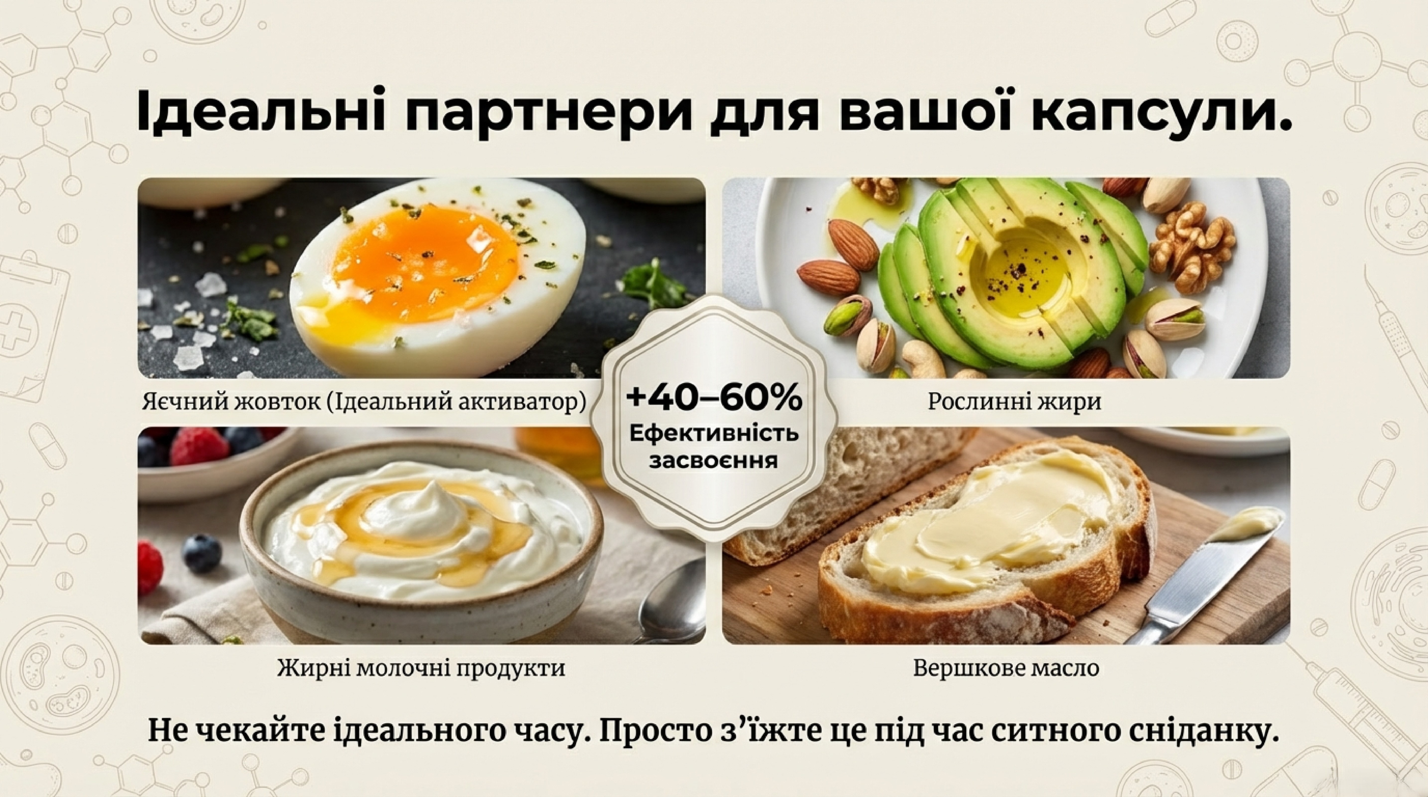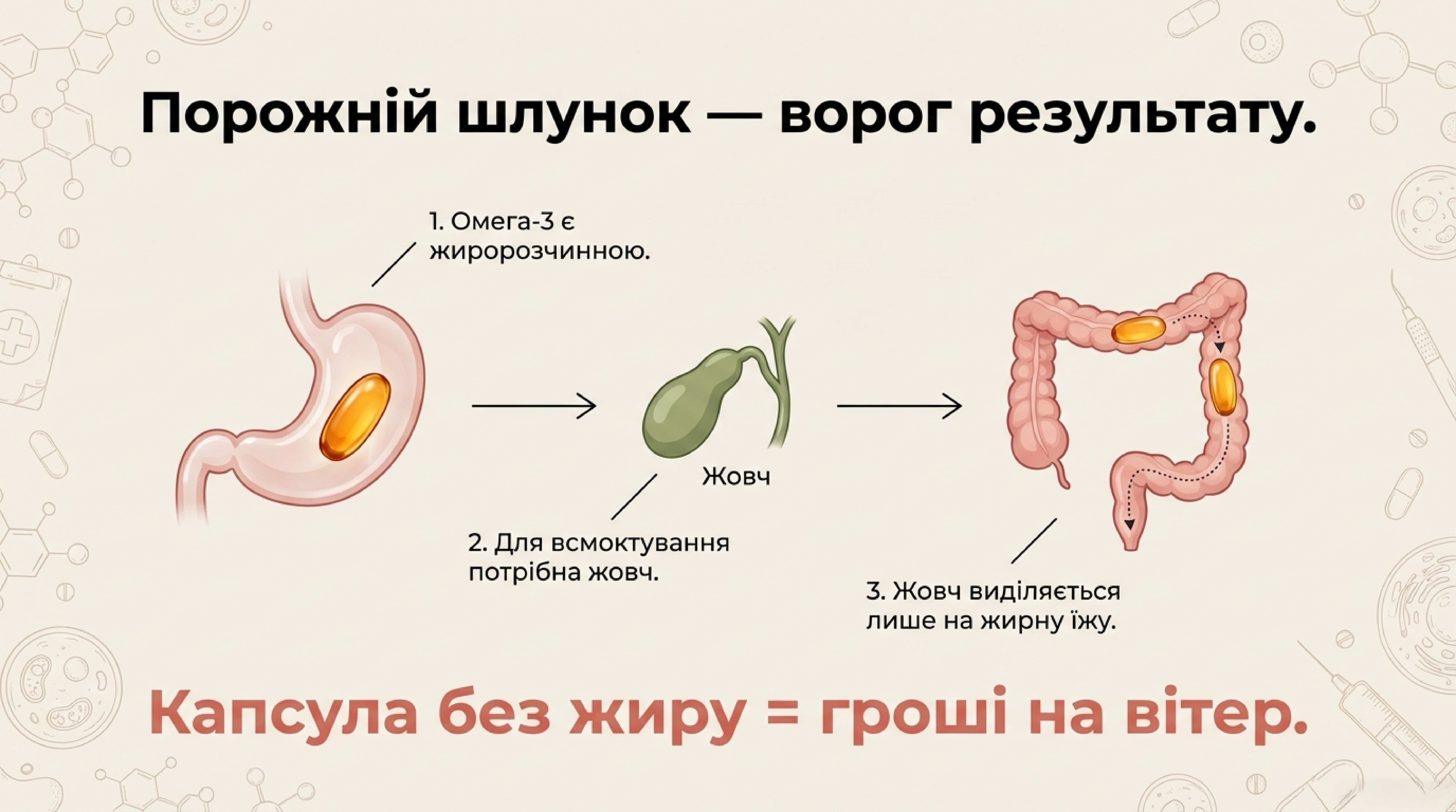 Важливо: Капсула, що потрапила в шлунок «наодинці», часто спричиняє нудоту, важкість або неприємний «рибний присмак». Це не ознака низької якості препарату, а наслідок того, що жир не почав розщеплюватися вчасно.