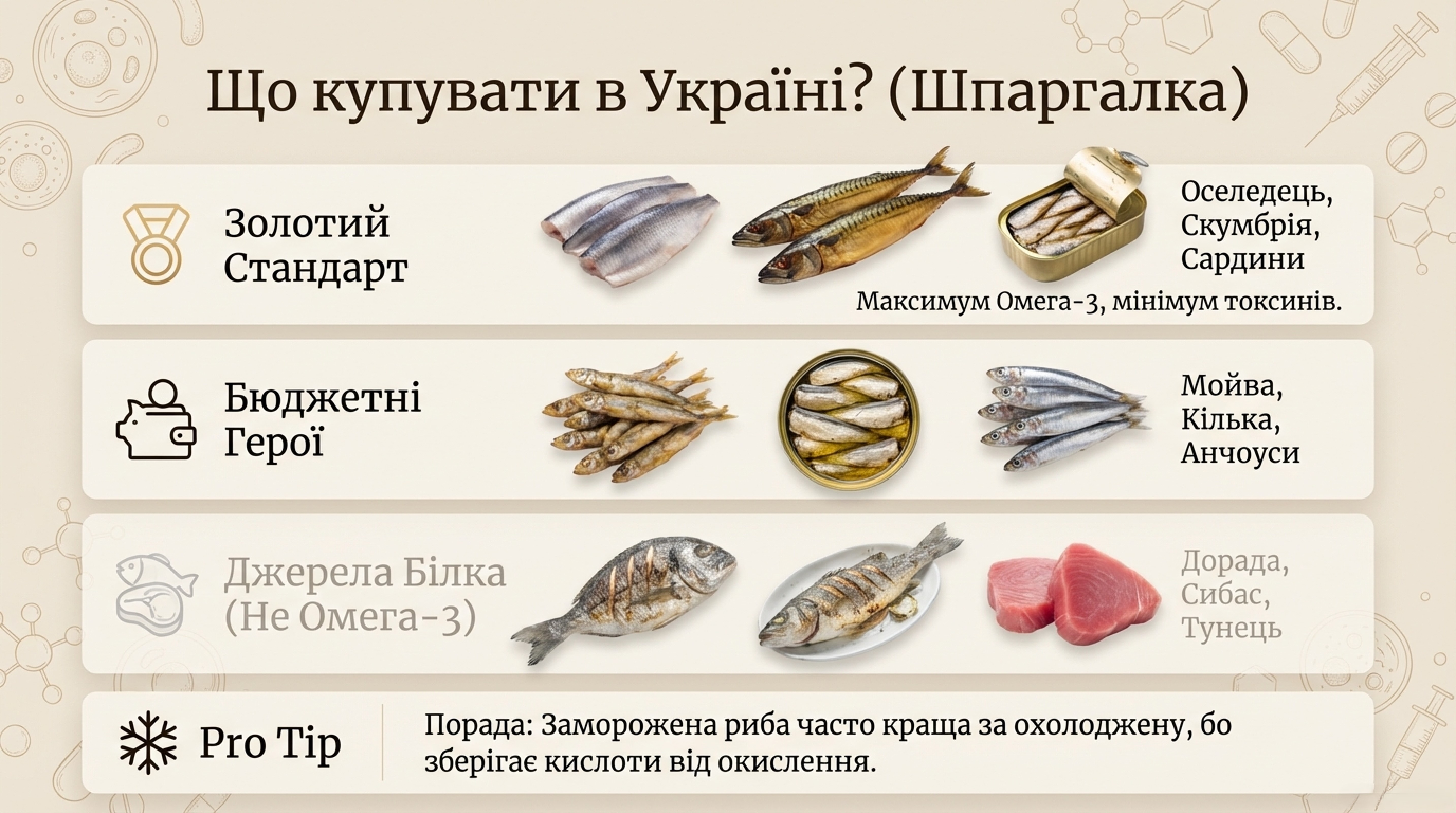 Важливий нюанс щодо свіжості: заморожена риба за кількістю омега-3 жодним чином не поступається охолодженій. Для українського споживача це суттєво: ліпше придбати якісну заморожену скумбрію, ніж сумнівний «свіжий» лосось.