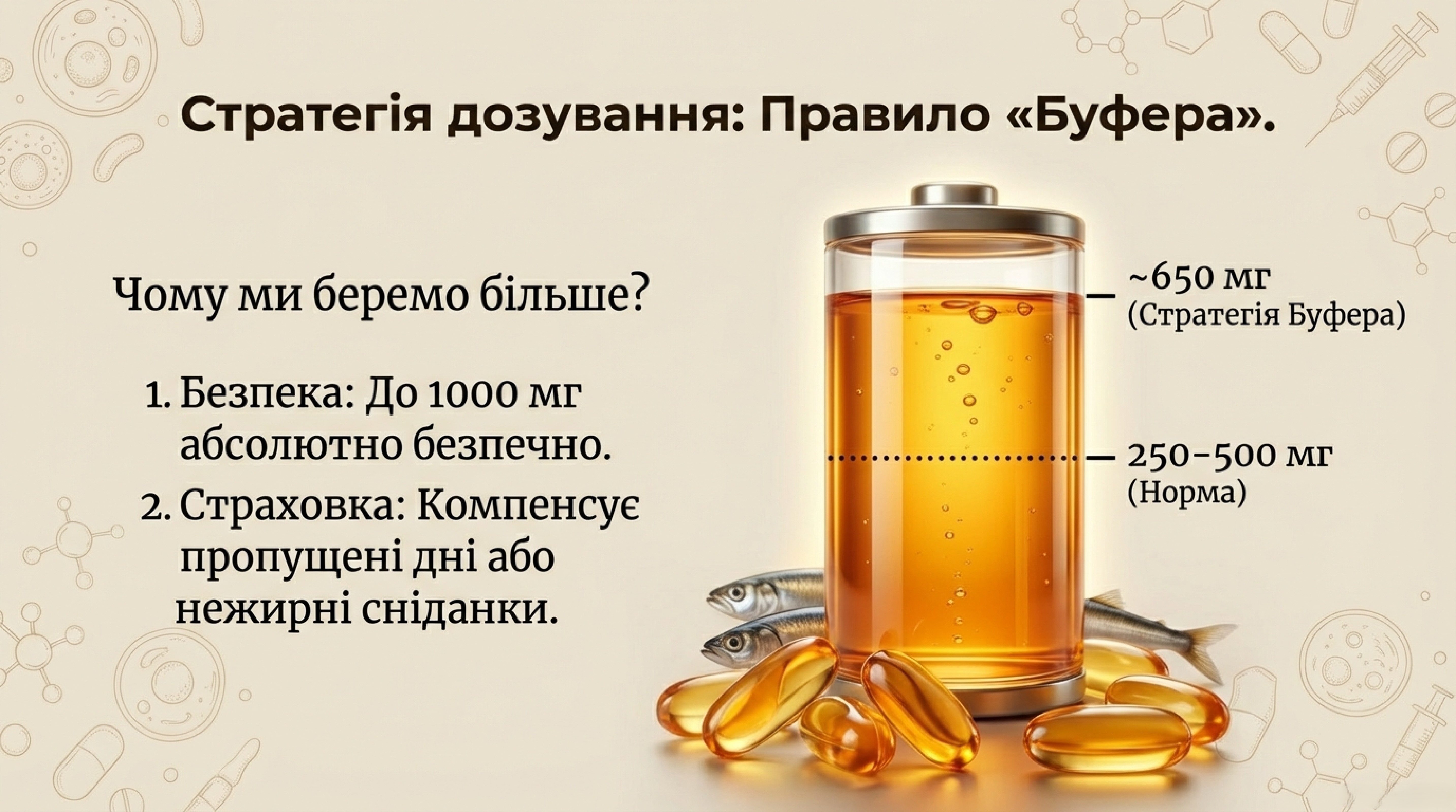 Доцільність «буферного» дозування: у препараті лікаря Комаровського, наприклад, міститься 650 мг загальної омега-3, де безпосередньо активних кислот — 550 мг (330 мг ЕПК + 220 мг ДГК). Чому це перевищує мінімальну норму?