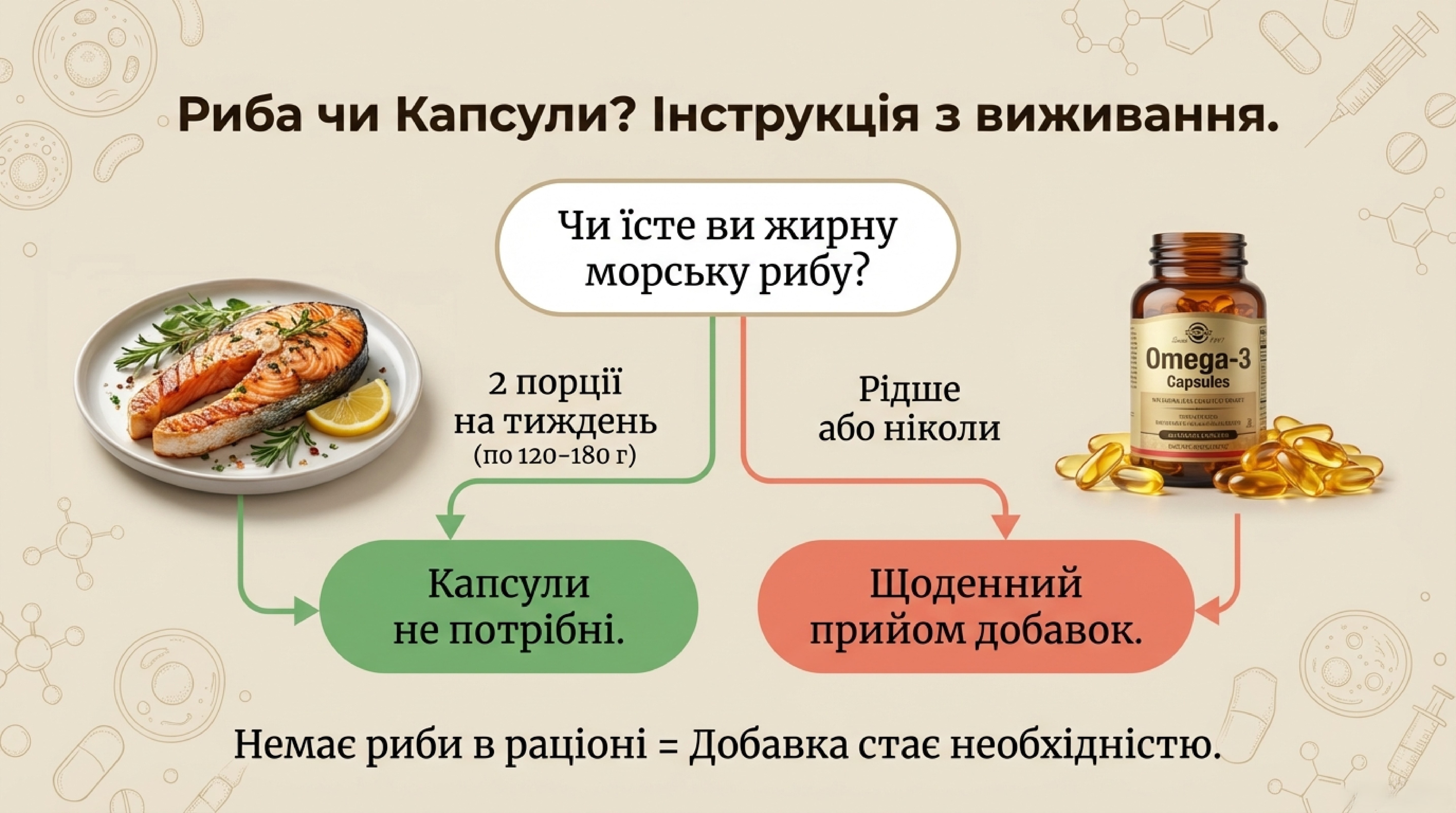 Ідеальний план простий: дві порції (по 120–180 г) жирної морської риби на тиждень. Якщо ви дотримуєтеся цього правила — капсули вам не потрібні. Якщо ж риби в раціоні бракує — добавка стає щоденною потребою незалежно від пори року.