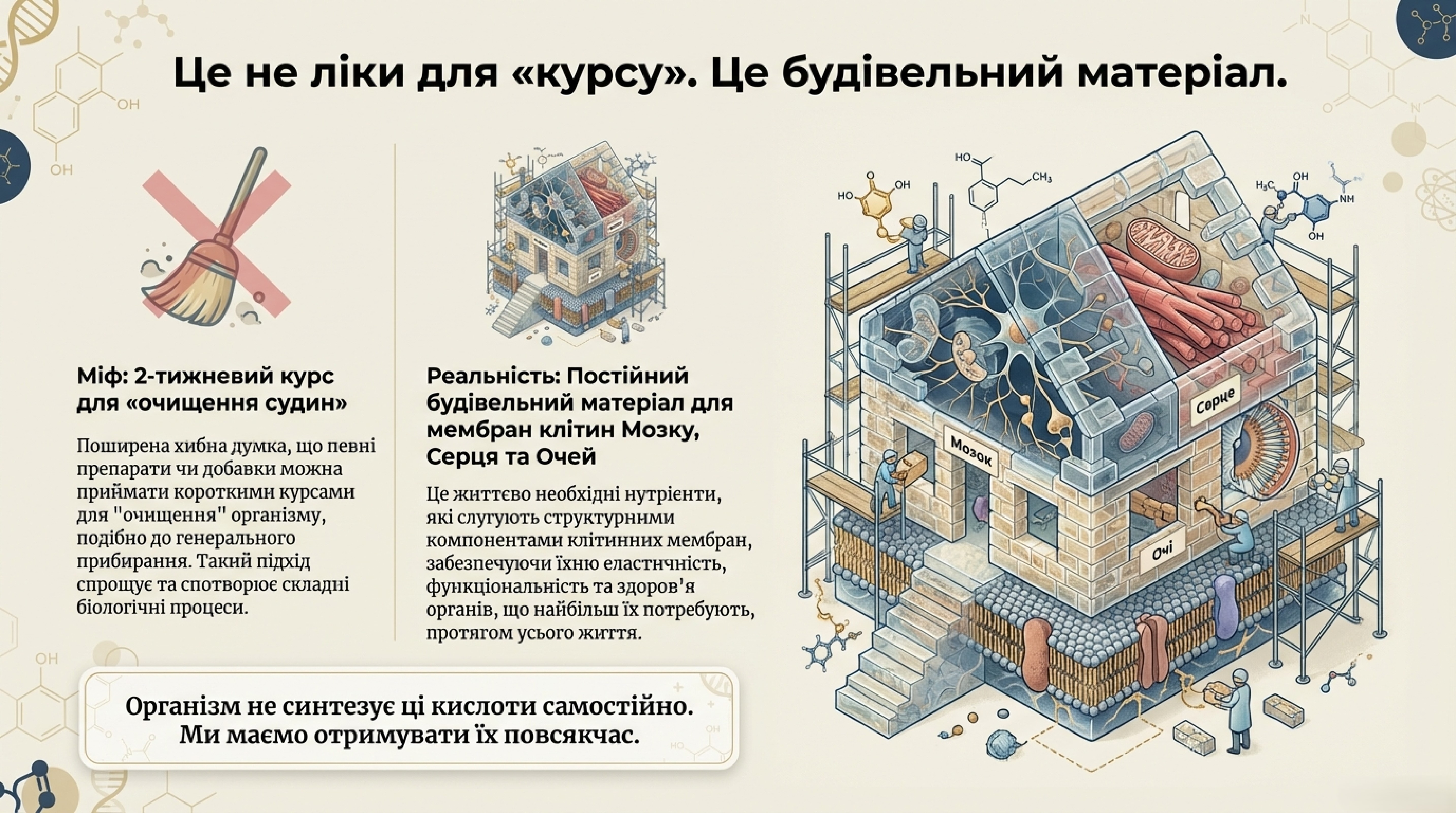 Хоча омега-3 є чи не в кожній аптечці, більшість вживає її хибно, сприймаючи як короткочасний «курс для судин». Насправді ж ці кислоти — базовий будівельний матеріал для мозку та серця, який має надходити в організм повсякчас. У цьому довгочиті, спираючись на принципи доказової медицини та поради лікаря-педіатра Комаровського, ми з’ясуємо, як здобути реальну користь від добавки й не витрачати кошти марно.
