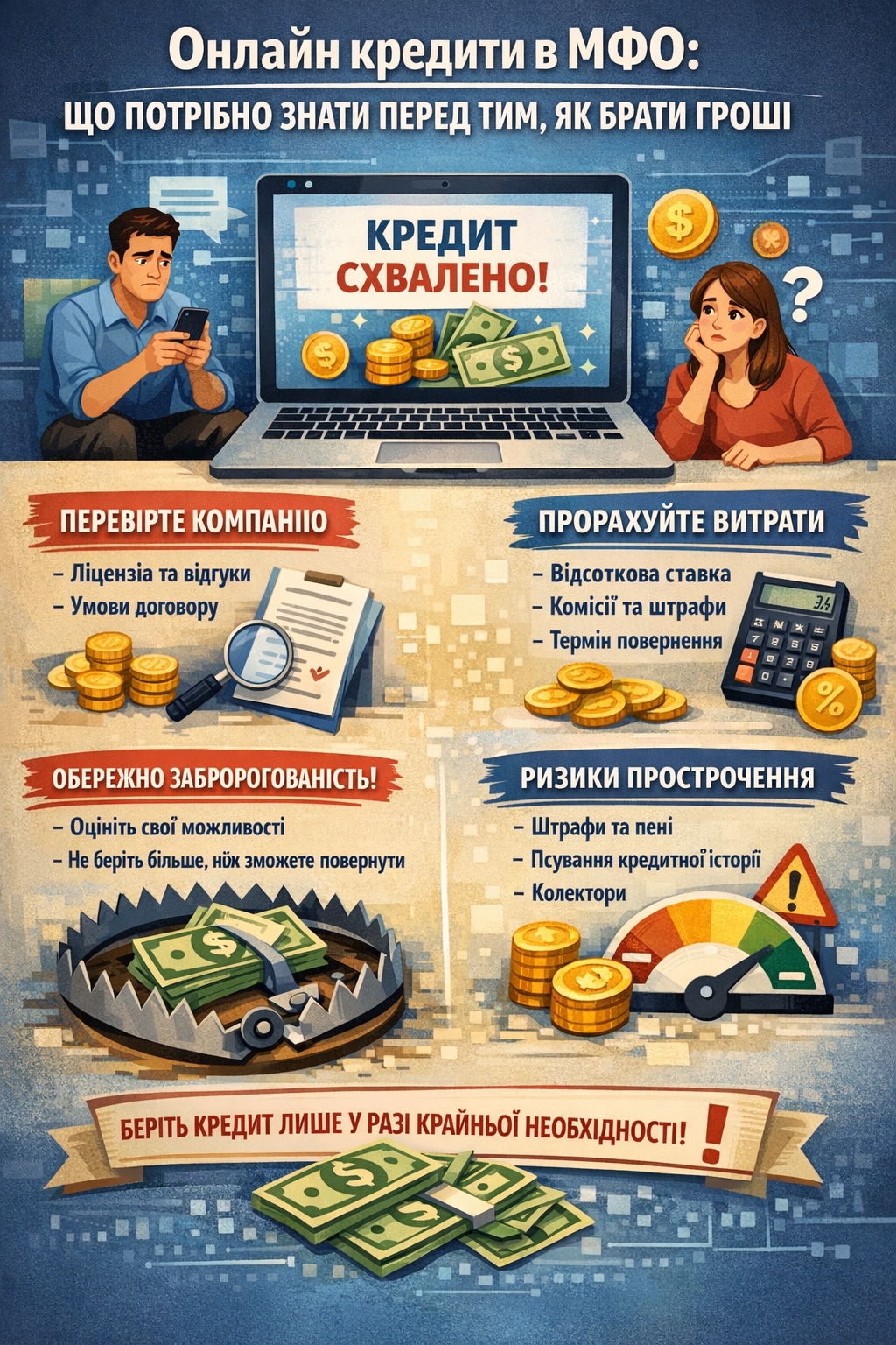 Читайте договір. Рахуйте повну суму повернення. Беріть тільки те, що точно зможете повернути. І пам'ятайте: найкращий кредит — той, якого вдалося уникнути.