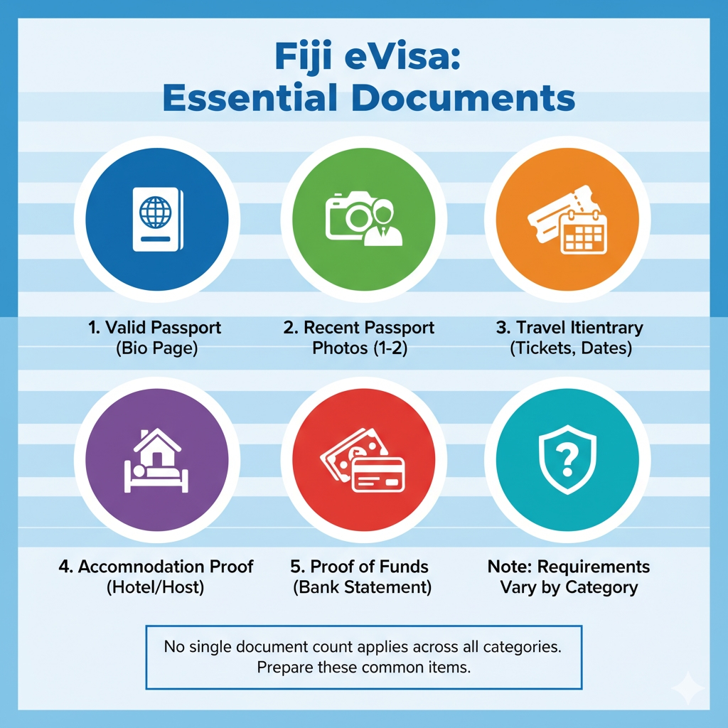 There is no single Document requirements for Fiji eVisa count across all categories because requirements vary, but typically you should expect to provide: