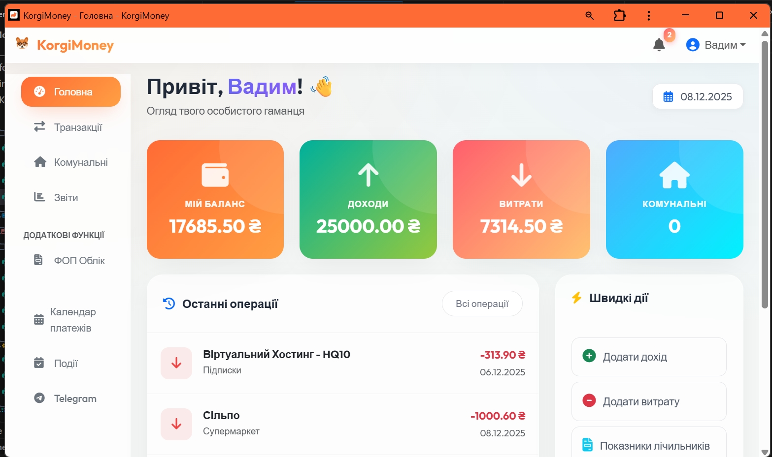 Спочатку я хотів структурувати прибутки, витрати, фіксувати комуналку і тому подібне. З цього почалась ідея зробити особисту бухгалтерю але в процесі розробки з’являлись додаткові “А було б добре якби…” Так і народилась ідея трансформувати просту “Бухгалтерію” в особисту CRM, яка допомагає жити простіше: контролювати фінанси, планувати задачі, нагадувати про важливе і знімати навантаження з голови. Фіксувати якісь події за рік, формувати гарні картинки з якимось підсумками і тому подібне.