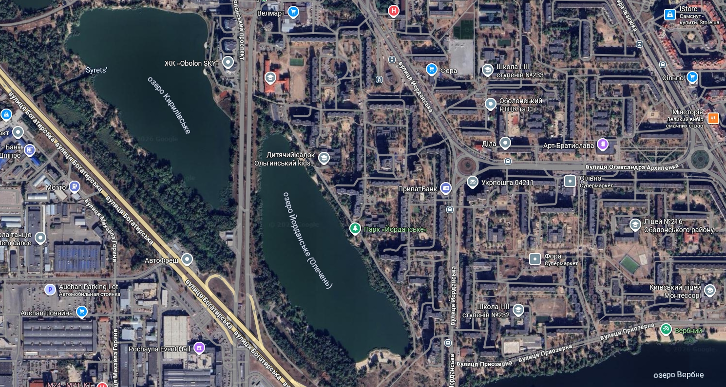 Найвідоміше озеро на місці Почайни — це частина системи водойм біля Оболоні (часто його теж називають “озеро Почайна”). Воно знаходиться поруч із Київ, недалеко від торгових центрів і житлових масивів.