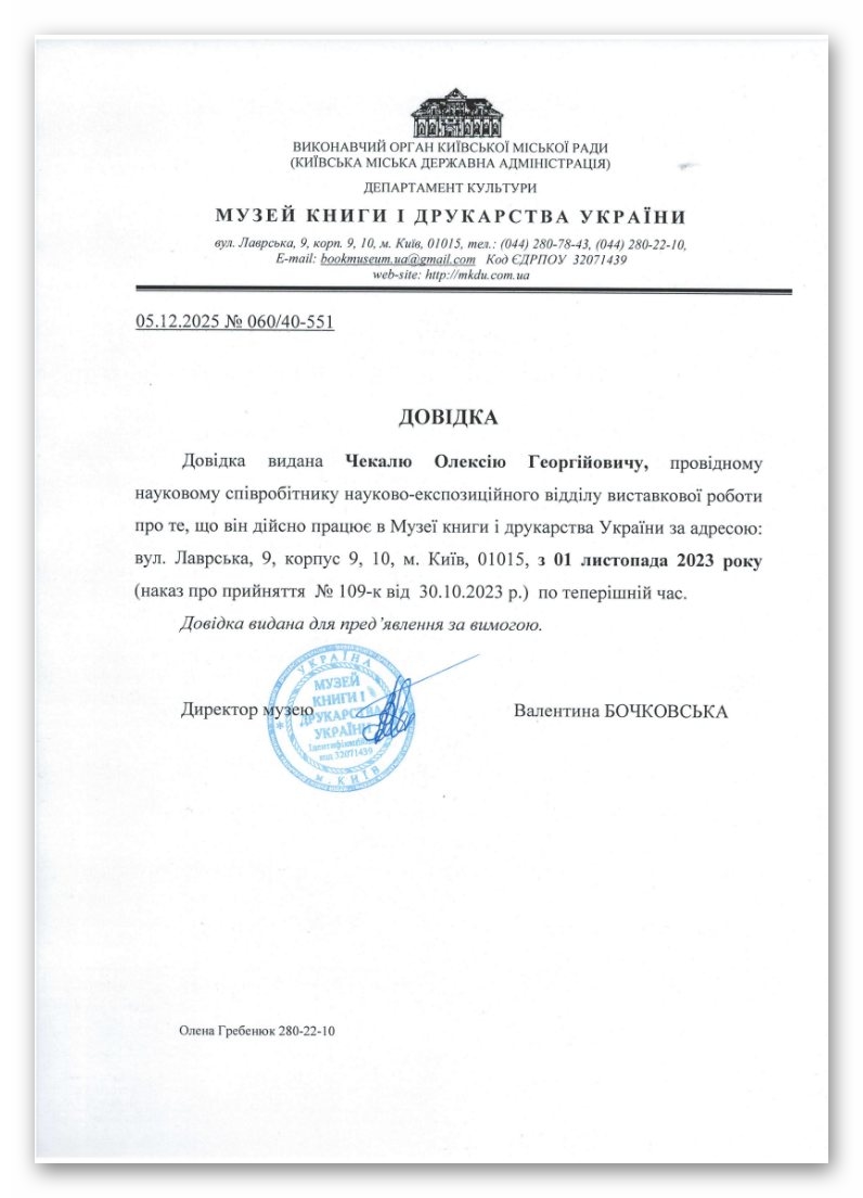 Провідний науковий співробітник Музей книги і друкарства України, фахівець Національний заповідник Києво-Печерська лавра Олексій Чекаль у 2021—2025 роках був дизайнером серії пересувних виставок, організованих Будинком російського зарубіжжя ім. Олександра Солженіцина (Москва, рос. Дом русского зарубежья, партнер фонда «Русский мир») за підтримки Департаменту культури Москви.