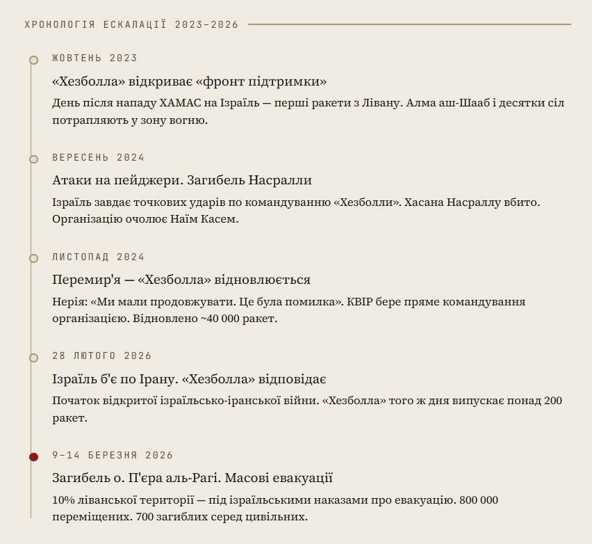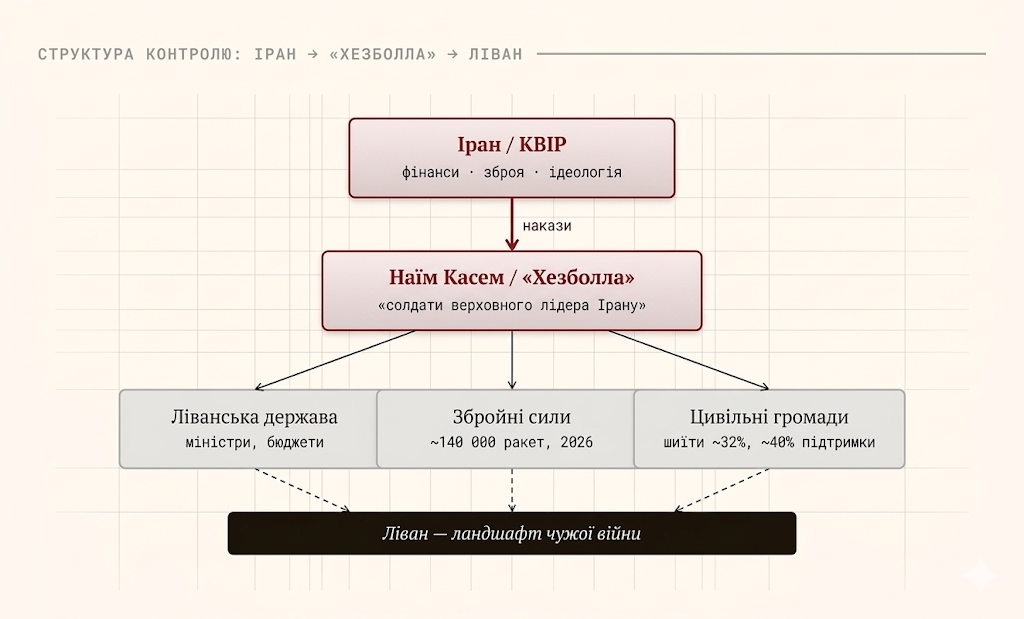 Концепція, розроблена генералом Касемом Сулеймані, передбачала «задушення» Ізраїлю одночасними атаками з кількох фронтів — Ліван, Сирія, Ірак, Ємен. «Хезболла» в цій схемі є не ліванським гравцем, а регіональним активом Тегерана. Саме тому, коли 28 лютого 2026 року Ізраїль завдав ударів по Ірану, «Хезболла» того ж дня випустила понад 200 ракет.