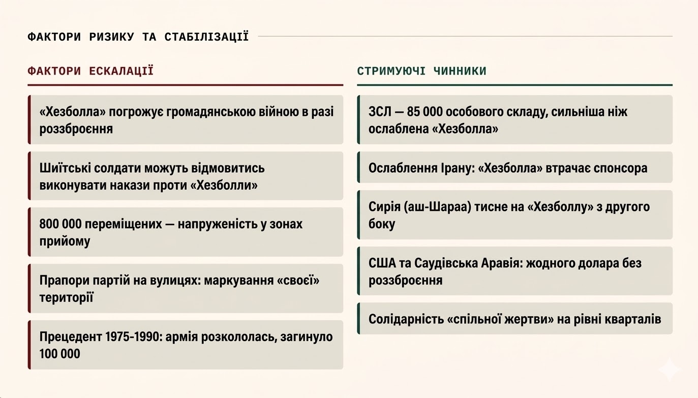 Але є й контраргумент: привид громадянської війни часто використовується «Хезболлою» як інструмент залякування — щоб держава не наважувалась її роззброїти.