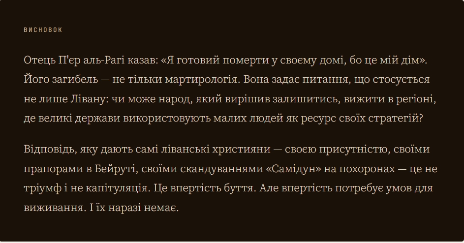 Загибель отця П’єра стала символом ескалації березня 2026 року, проявивши глибшу структурну трагедію: ліванські християни опинилися в епіцентрі конфлікту, який не є їхнім. Вони не є суб'єктами цієї війни. Вони — її заручники та ландшафт.