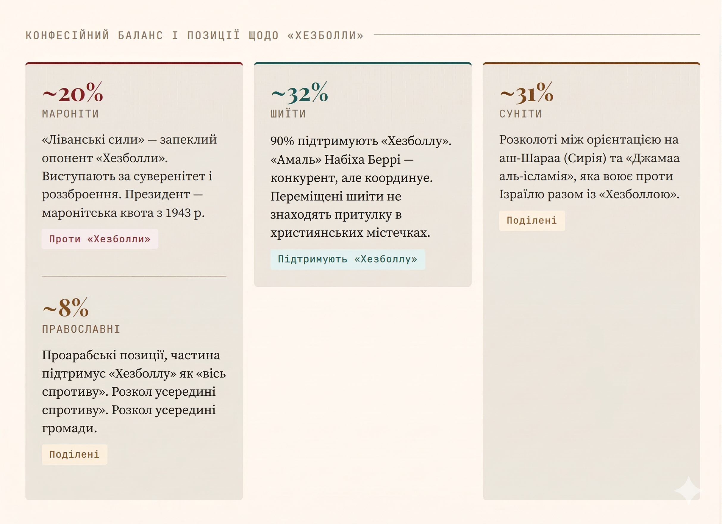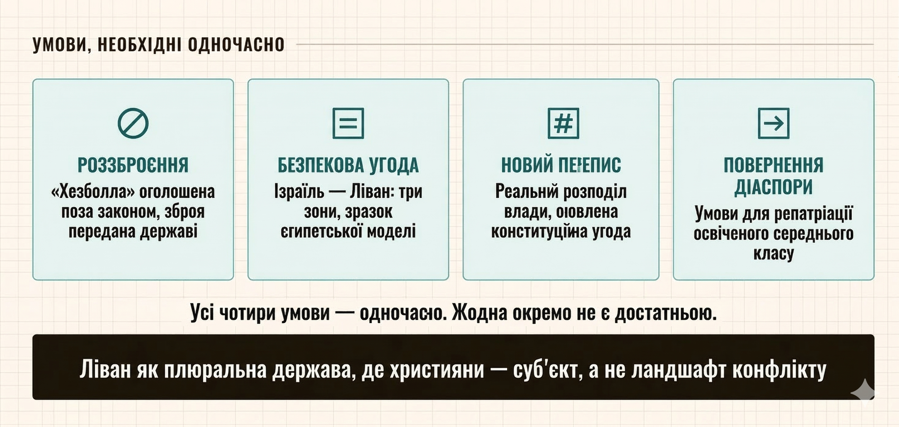 Водночас для ліванських християн мало що від цього залежить безпосередньо. Їхні проблеми глибші — структурні. Конфесійна система, що була покликана захищати плюральність, виявилась механізмом її заморозки й поступової ерозії.
