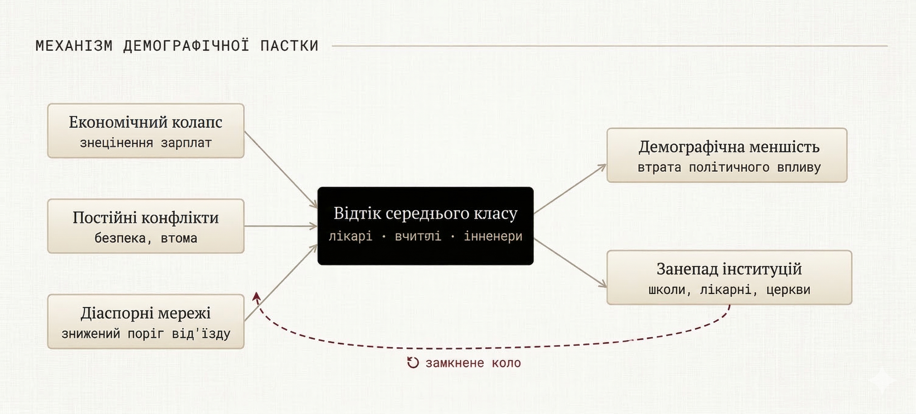 Ця крива — не наслідок однієї війни. Вона складається з кількох шарів: вища еміграційна схильність (християни мають потужніші діаспорні мережі), нижча народжуваність і те, що кожна хвиля нестабільності виштовхує насамперед середній клас — лікарів, учителів, інженерів. Тих, кому є куди їхати. Ліван залишається без своєї освіченої еліти.