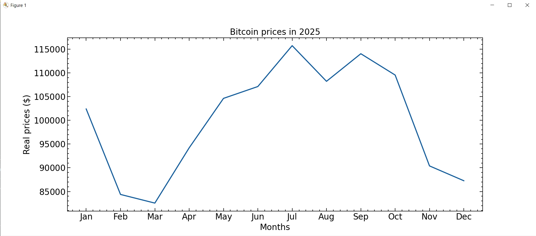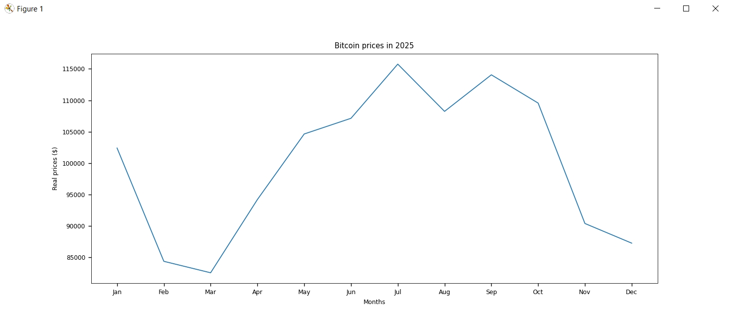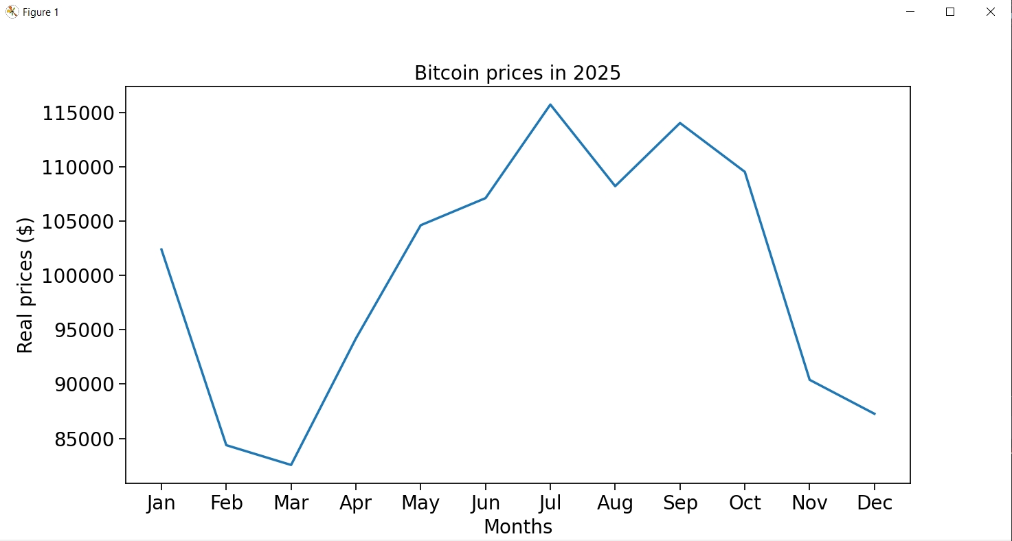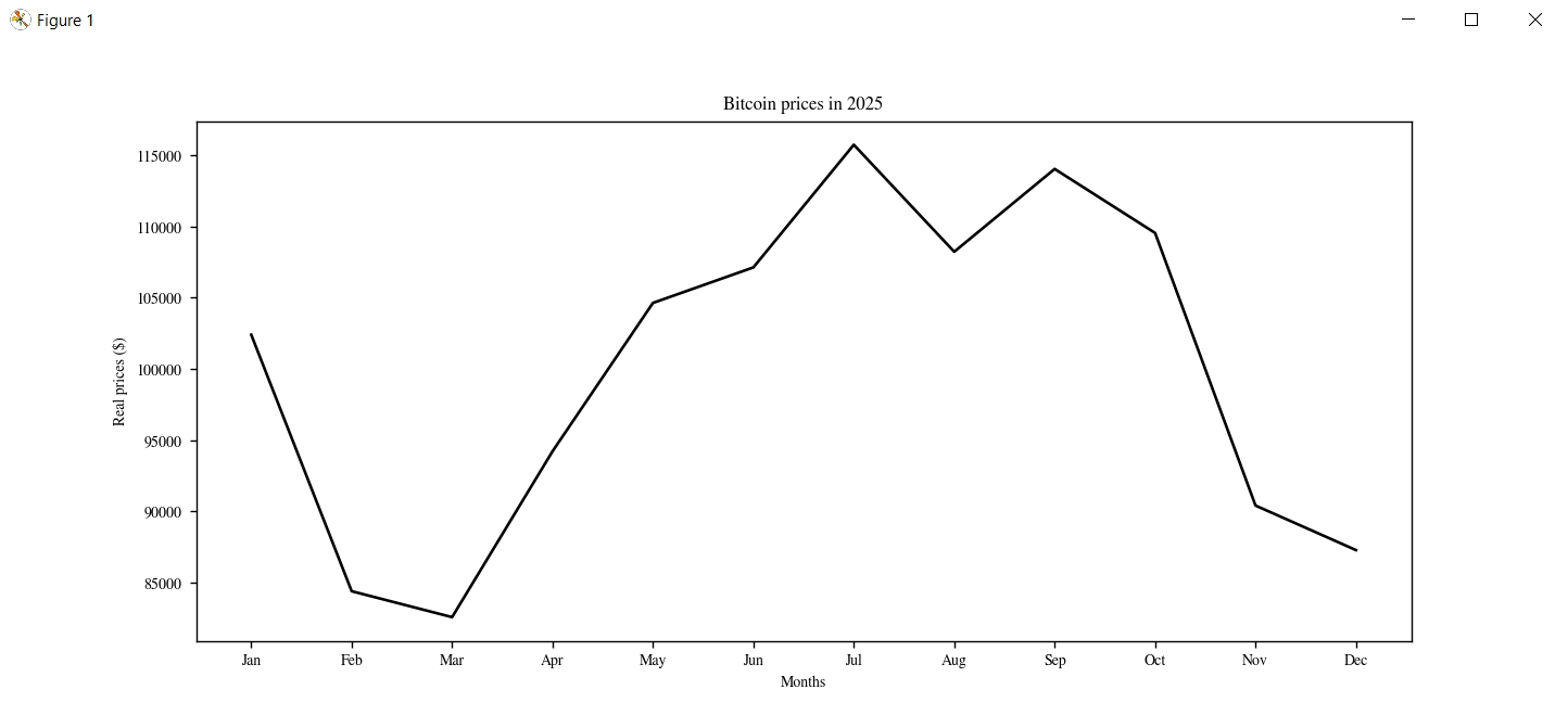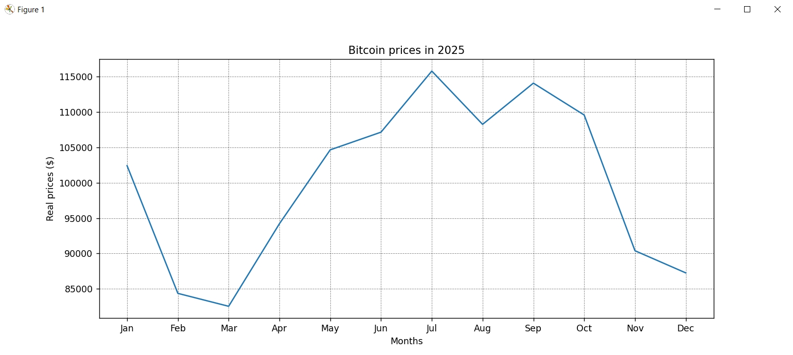bitcoin_prices_labels = ["Jan", "Feb", "Mar", "Apr", "May", "Jun", "Jul", "Aug", "Sep", "Oct", "Nov", "Dec"]Далі створюємо сам графік: