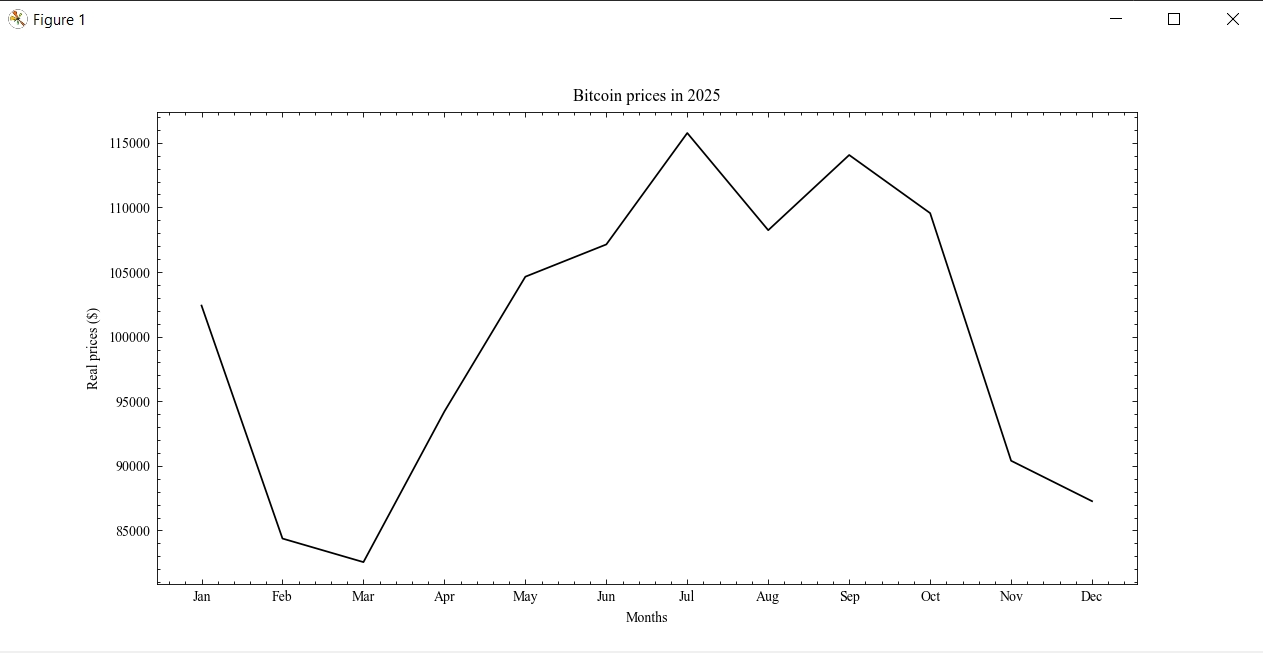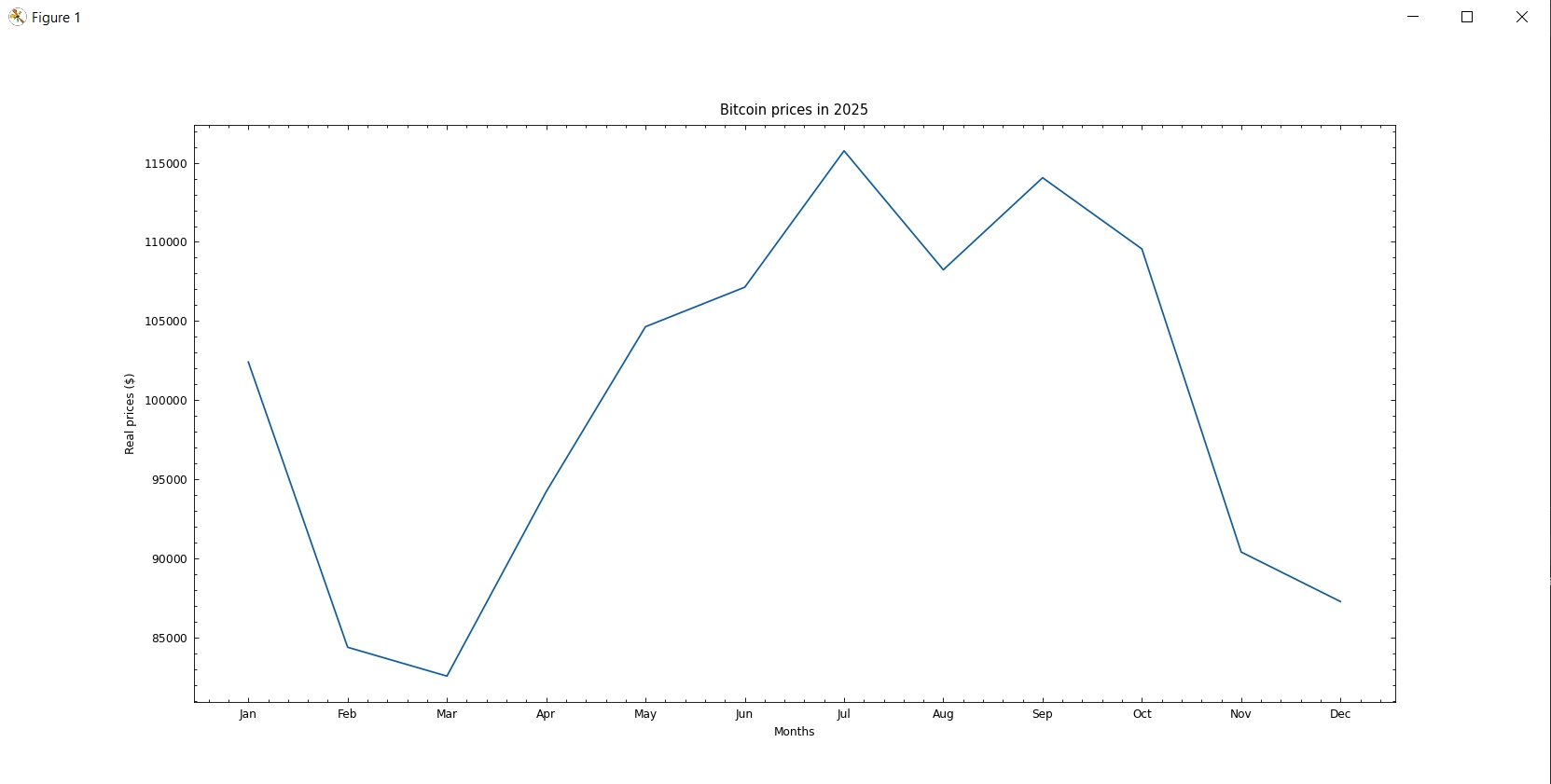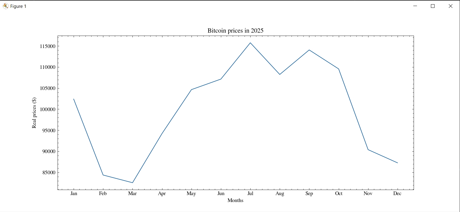 import matplotlib.pyplot as pltУ якоті даних візьмемо вартість біткоїна за 2025 рік: