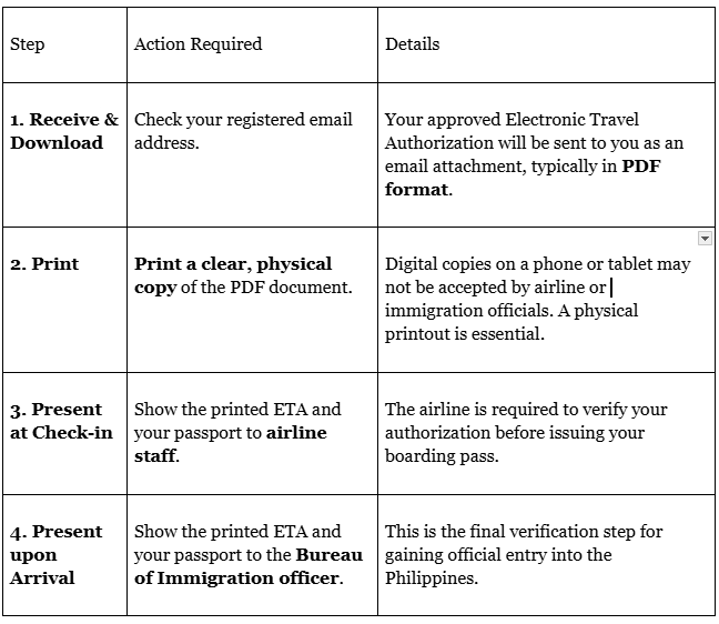 Congratulations on the approval of your electronic visa (eVisa), often referred to as the Electronic Travel Authorization (ETA), for the Philippines.