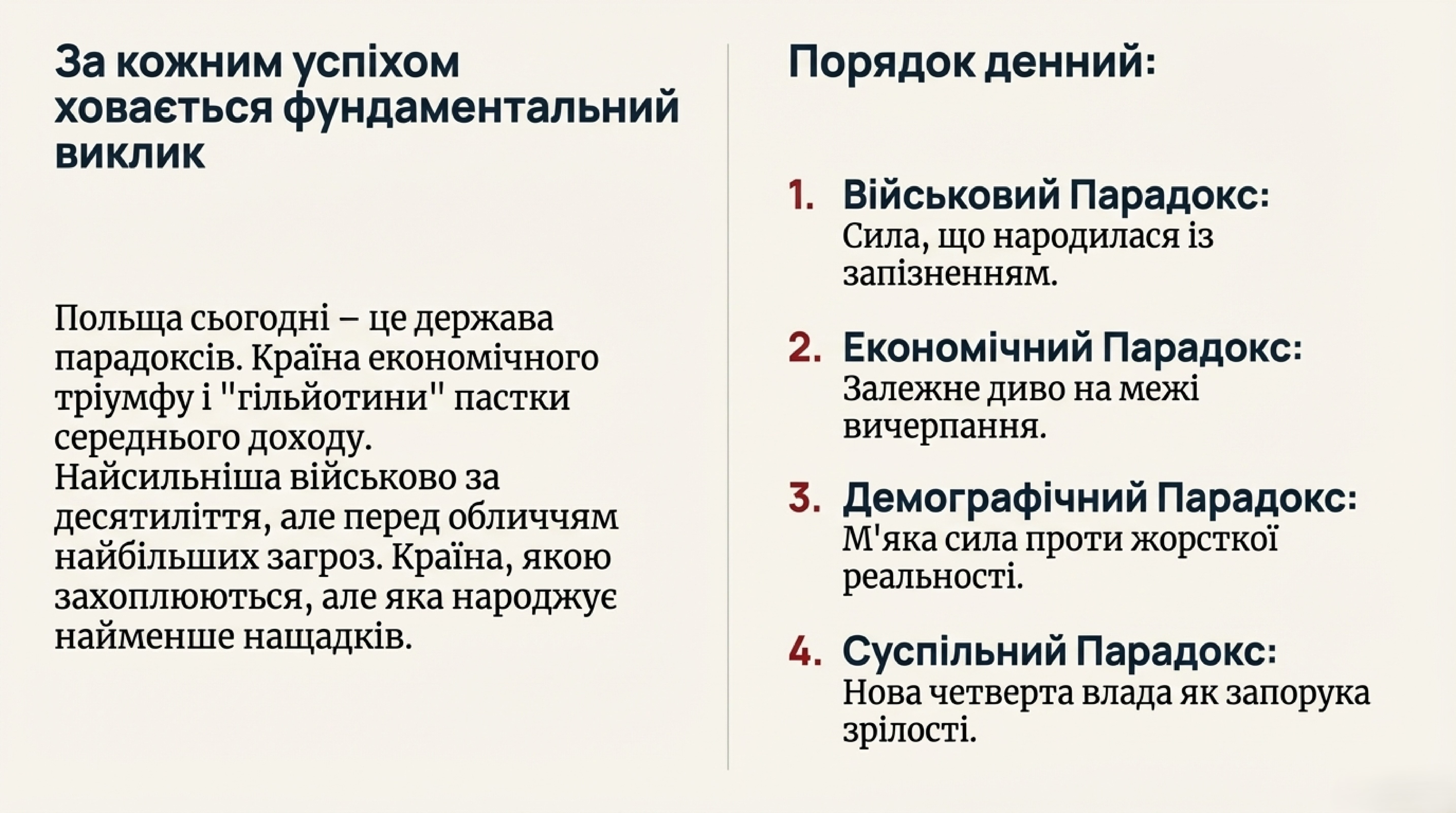 Проте за цим блискучим фасадом криється складна, суперечлива реальність. Скарги та побоювання, що лунають усередині країни, не безпідставні. Польща 2026 року — це держава парадоксів: країна економічного дива, що ризикує опинитися у стагнації; країна з найпотужнішою армією за останні десятиліття, яка водночас постає перед найтяжчими загрозами в новітній історії. Ця стаття досліджує п’ять найбільш разючих суперечностей, що визначають сьогодення та майбутнє Польщі. Це спроба збагнути, як країна, що досягла свого «нового золотого віку», намагається впоратися з викликами, які можуть або винести її на новий рівень, або залишити в пастці минулих здобутків.
