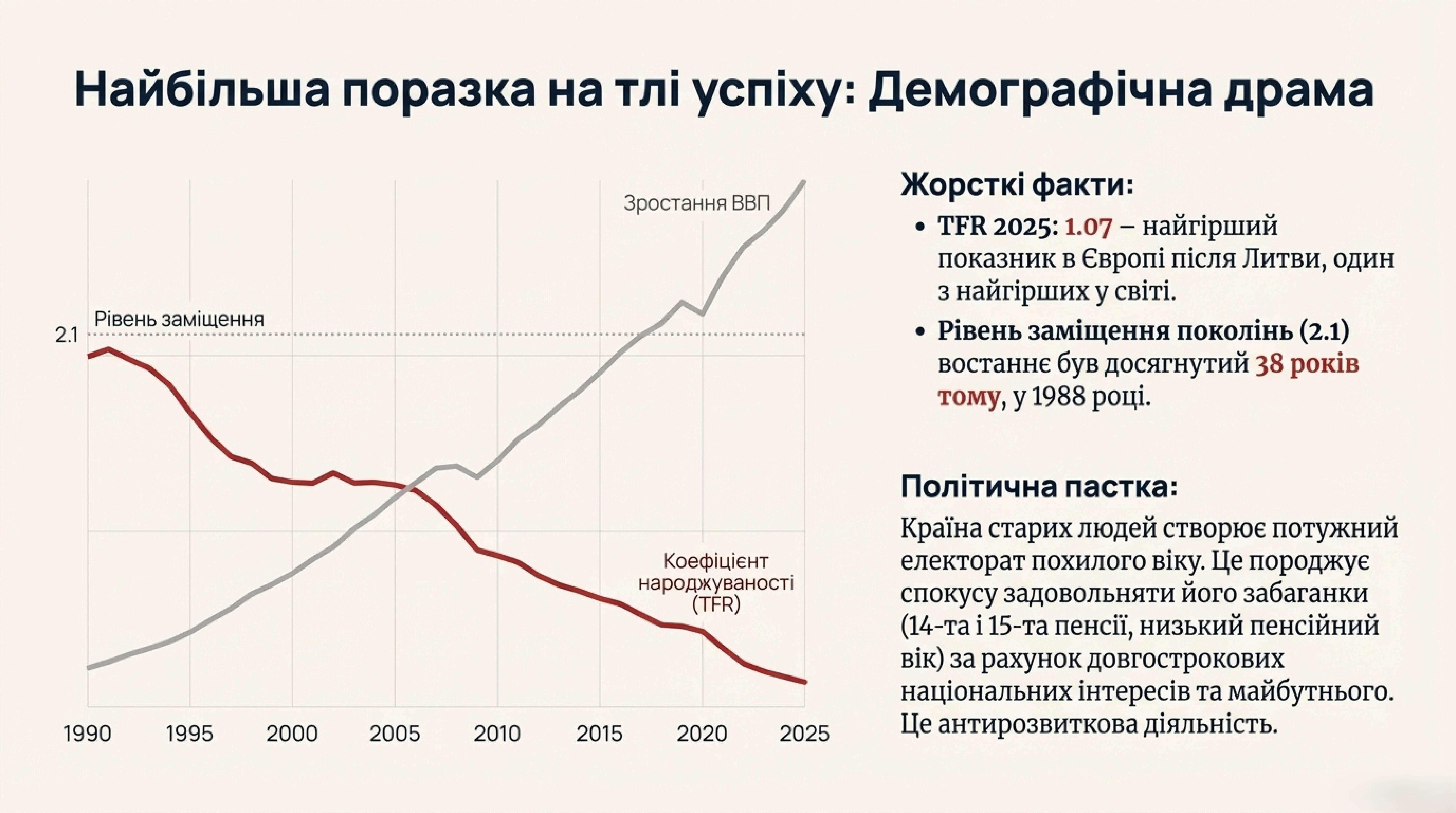 Старіння нації є прямою загрозою для економіки. Воно також створює небезпечну політичну динаміку: чим більшим стає електорат пенсійного віку, тим більша спокуса у політиків задовольняти його короткострокові забаганки (наприклад, «14-та і 15-та пенсії») на шкоду стратегічним інтересам країни.