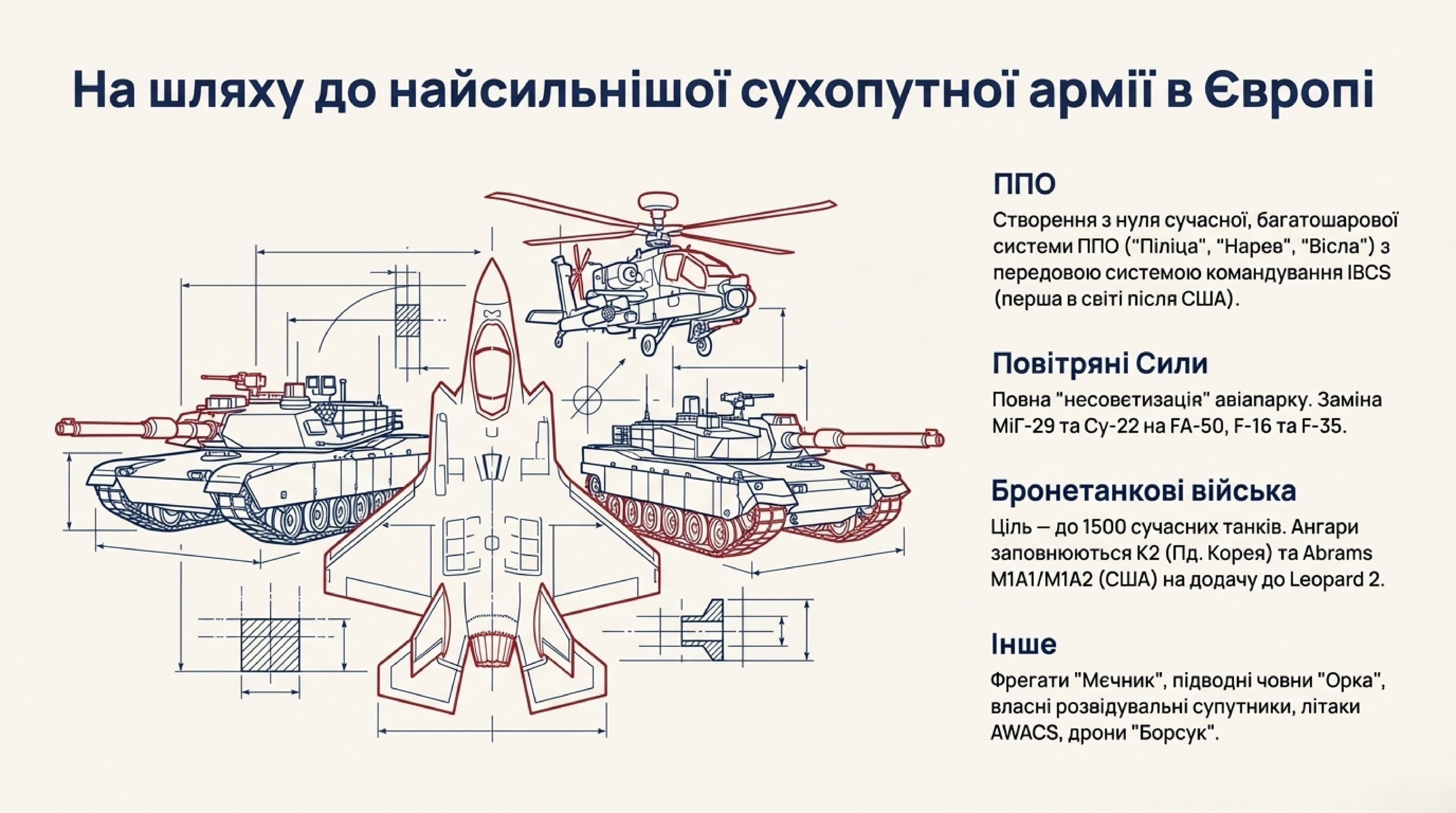 ППО: практично з нуля створюється багатошарова система, що містить комплекси Patriot (програма «Вісла») та передову систему керування IBCS, яку Польща впроваджує першою у світі після США;