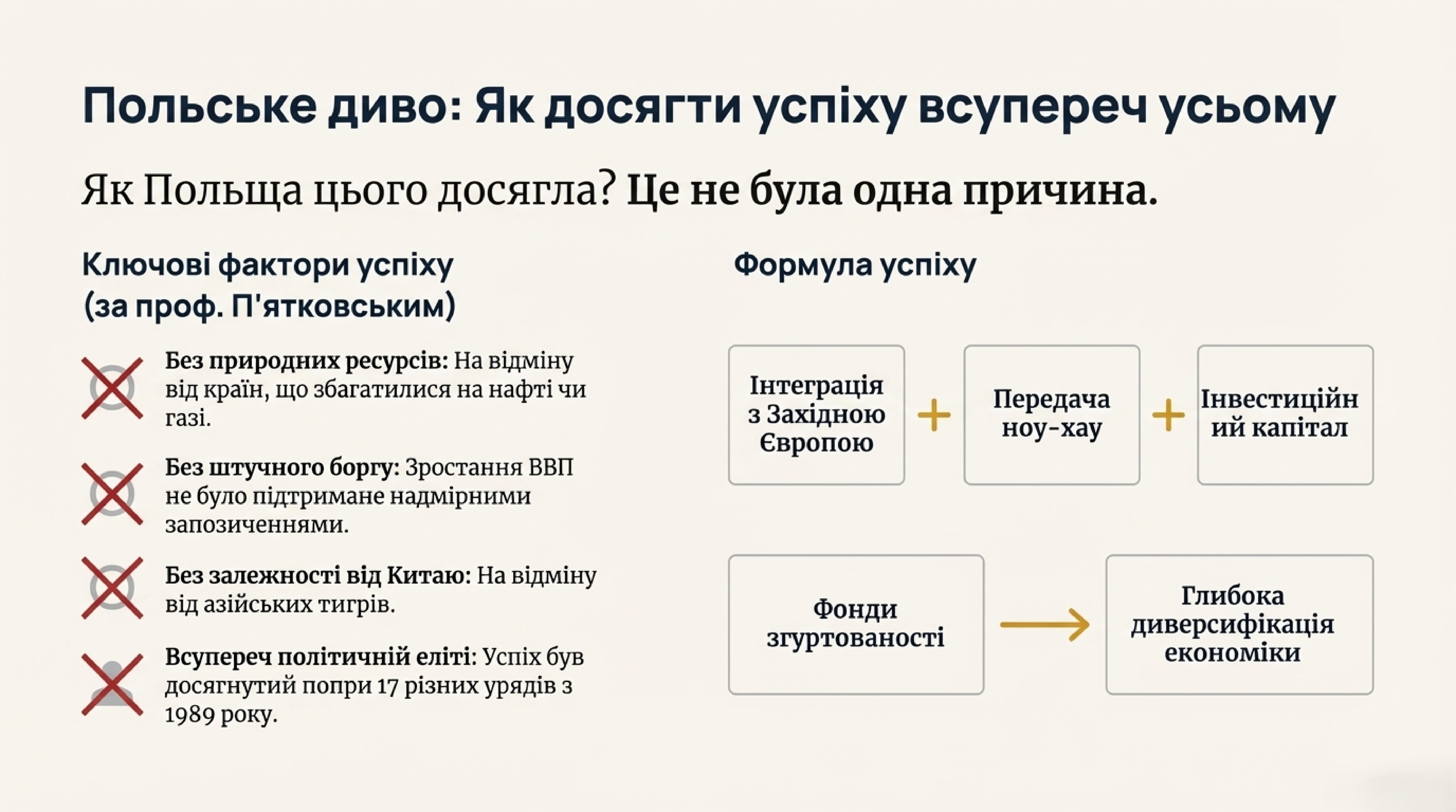 «Польща досягла надзвичайного економічного успіху всупереч усім прогнозам. По-перше, на відміну від багатьох інших країн, що збагатилися на нафті, природному газі та інших ресурсах, Польща майже не має копалин. По-друге, зростання польського ВВП не було штучно підтримане боргами. По-третє, на відміну від "азійських тигрів" та багатьох інших ринків, що розвиваються, успіх Польщі не став наслідком зростання економічної потужності Китаю. Нарешті, найважливіше: Польща досягла успіху попри те, що з 1989 року владу в країні здійснювали аж 17 різних урядів. З іронією можна сказати, що все це сталося всупереч політичній еліті, а не завдяки їй...»