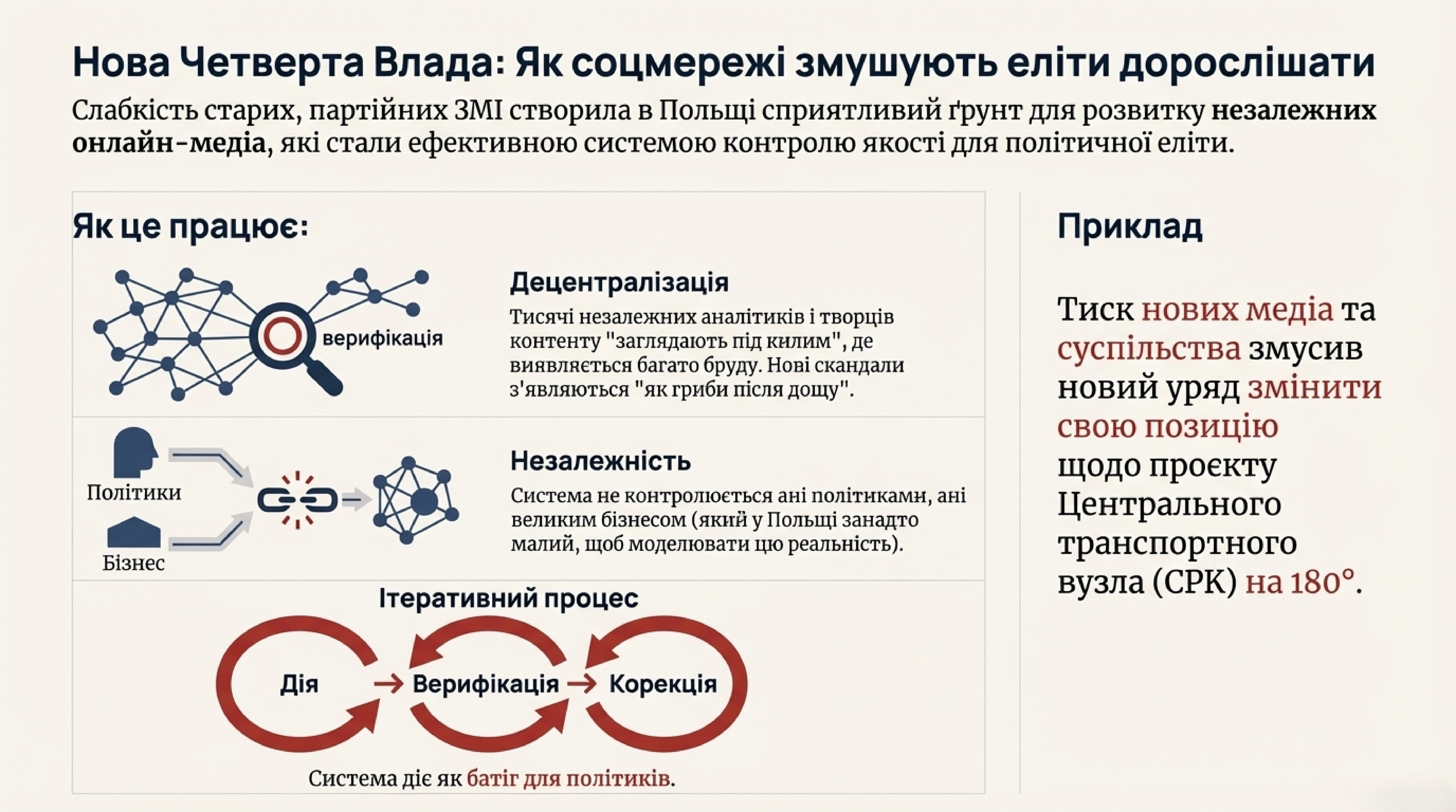Традиційно соцмережі вважають джерелом дезінформації. Але в Польщі через слабкість і заангажованість традиційних ЗМІ вони перетворилися на систему громадського контролю — справжню «четверту владу». Незалежні аналітики отримали можливість викривати корупцію без цензури редакторів.
