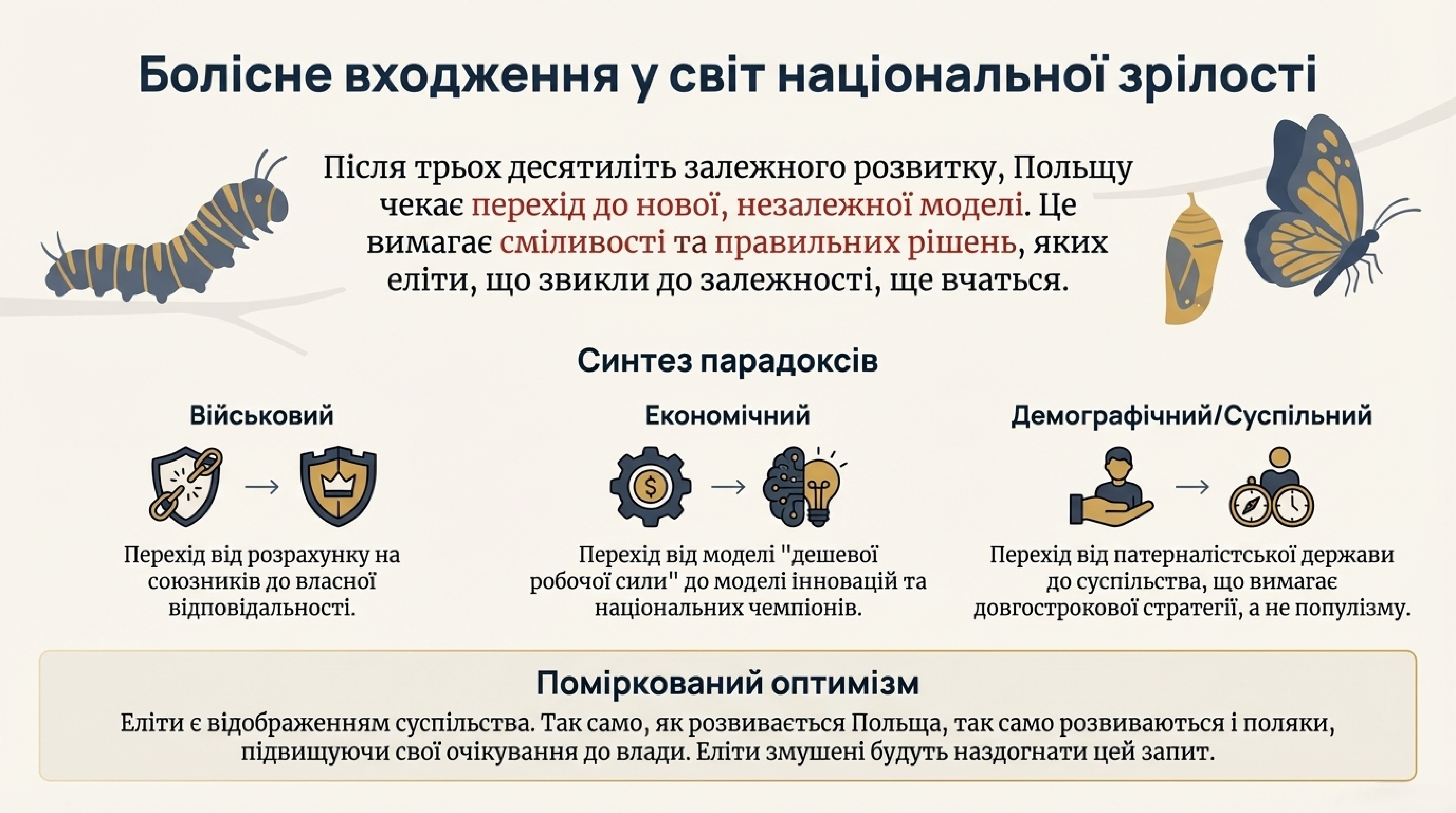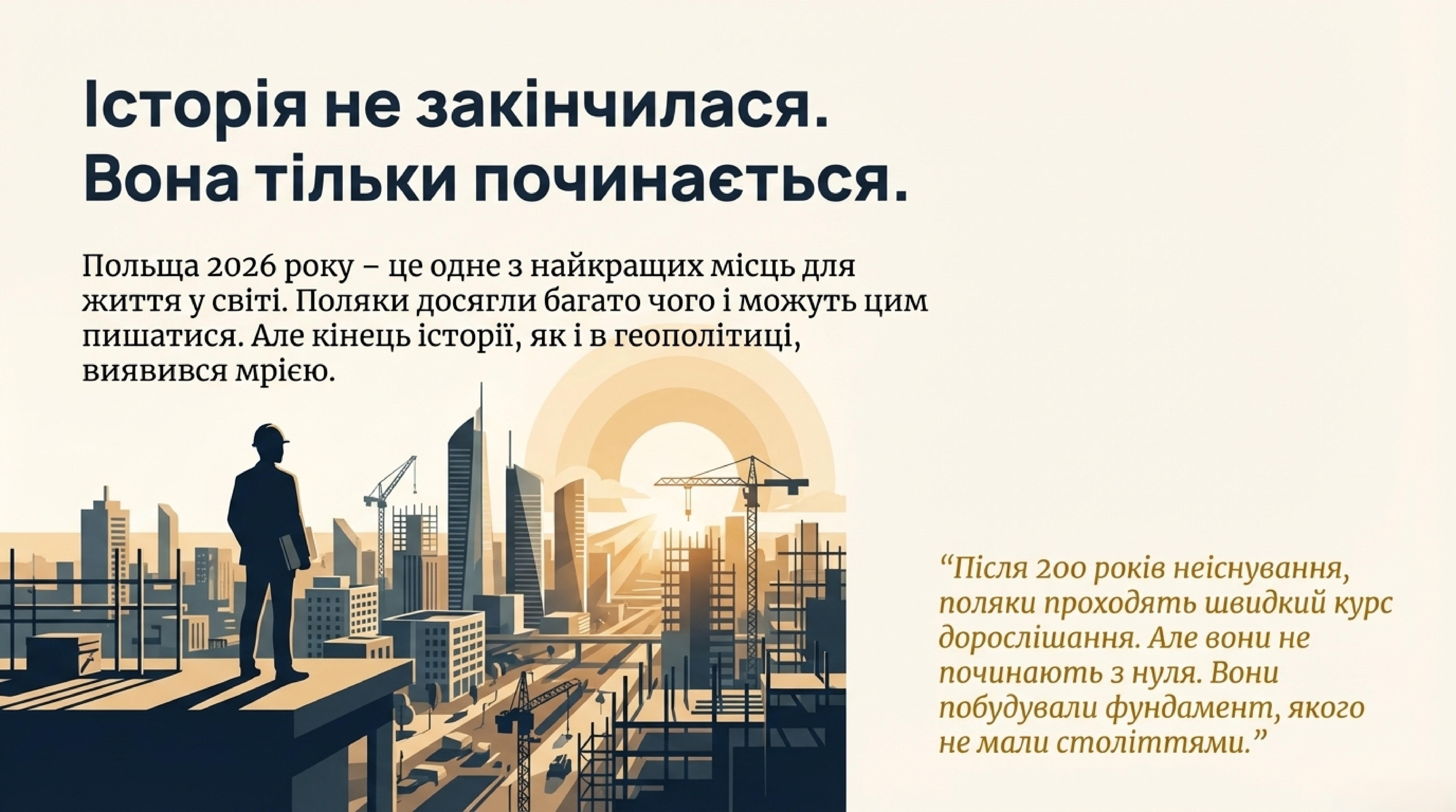 Польща 2026 року — унікальна країна. Вона збудувала фундамент, якого не мала століттями. Останнім іспитом стане те, чи зможуть еліти зрівнятися у зрілості з власним суспільством, щоб здійснити перехід у незалежне майбутнє. Відповідь на це питання визначить долю країни на десятиліття вперед.
