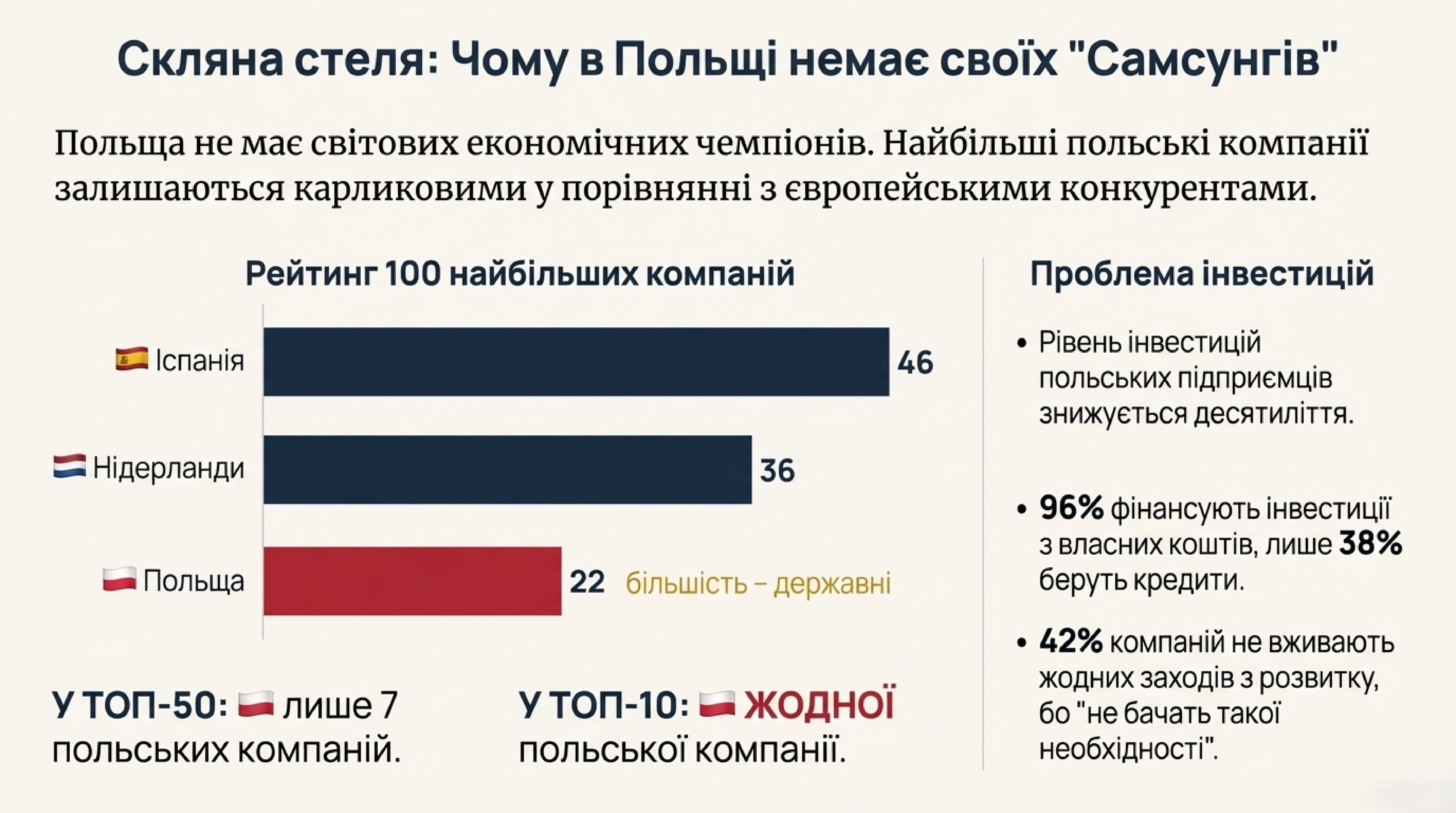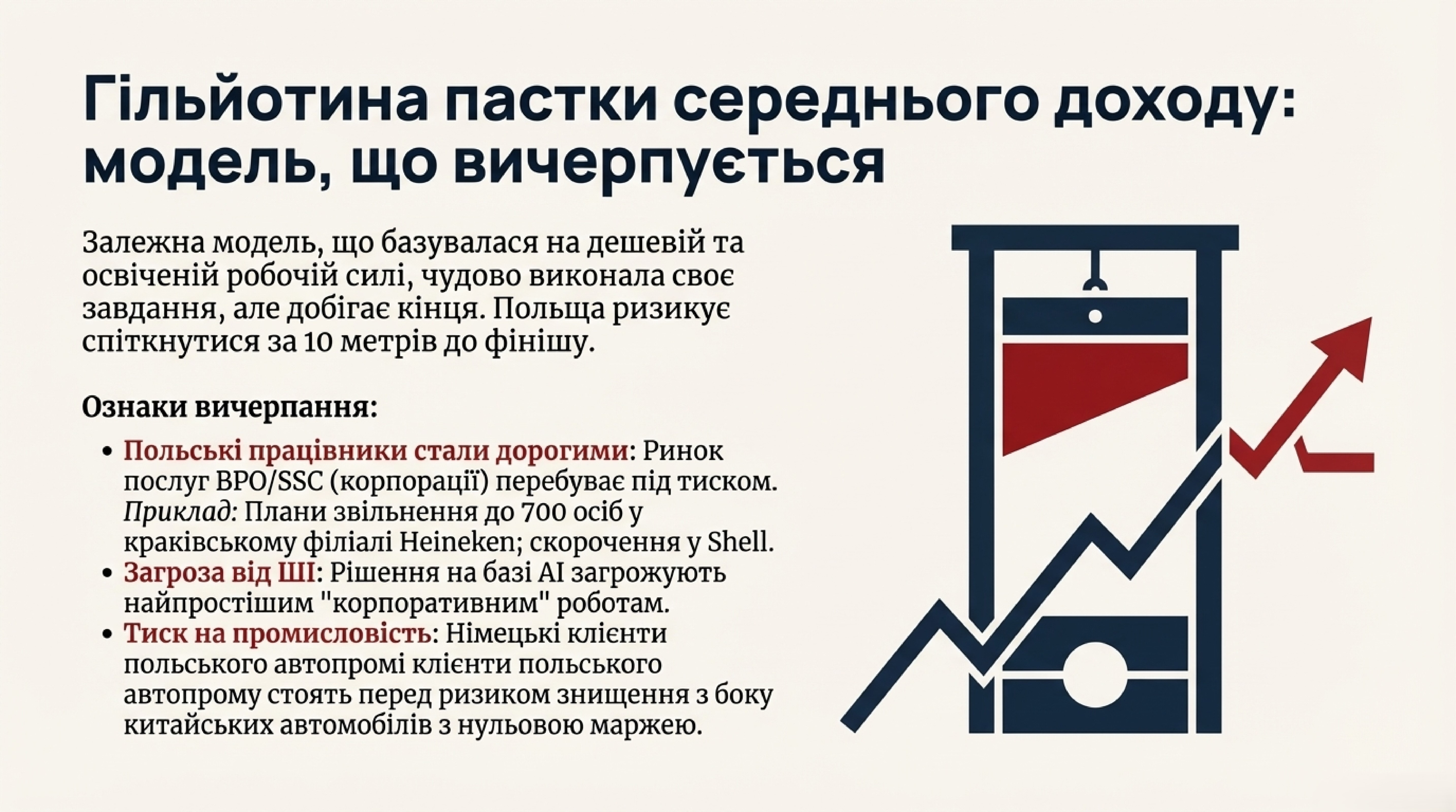 Однак у цьому успіху криється парадокс. Його побудовано на «залежній моделі»: дешева та кваліфікована робоча сила, приплив іноземних інвестицій та інституційного ноу-хау, а також географічна близькість до Німеччини. Ця модель чудово виконала своє завдання, вивівши Польщу в абсолютно іншу економічну лігу, але сьогодні вона вичерпується. Вартість праці зростає, сектор бізнес-послуг (BPO/SSC) опиняється під тиском з боку дешевших конкурентів з Індії та впровадження штучного інтелекту, а промисловість критично залежить від німецького ринку, який сам переживає структурні проблеми.
