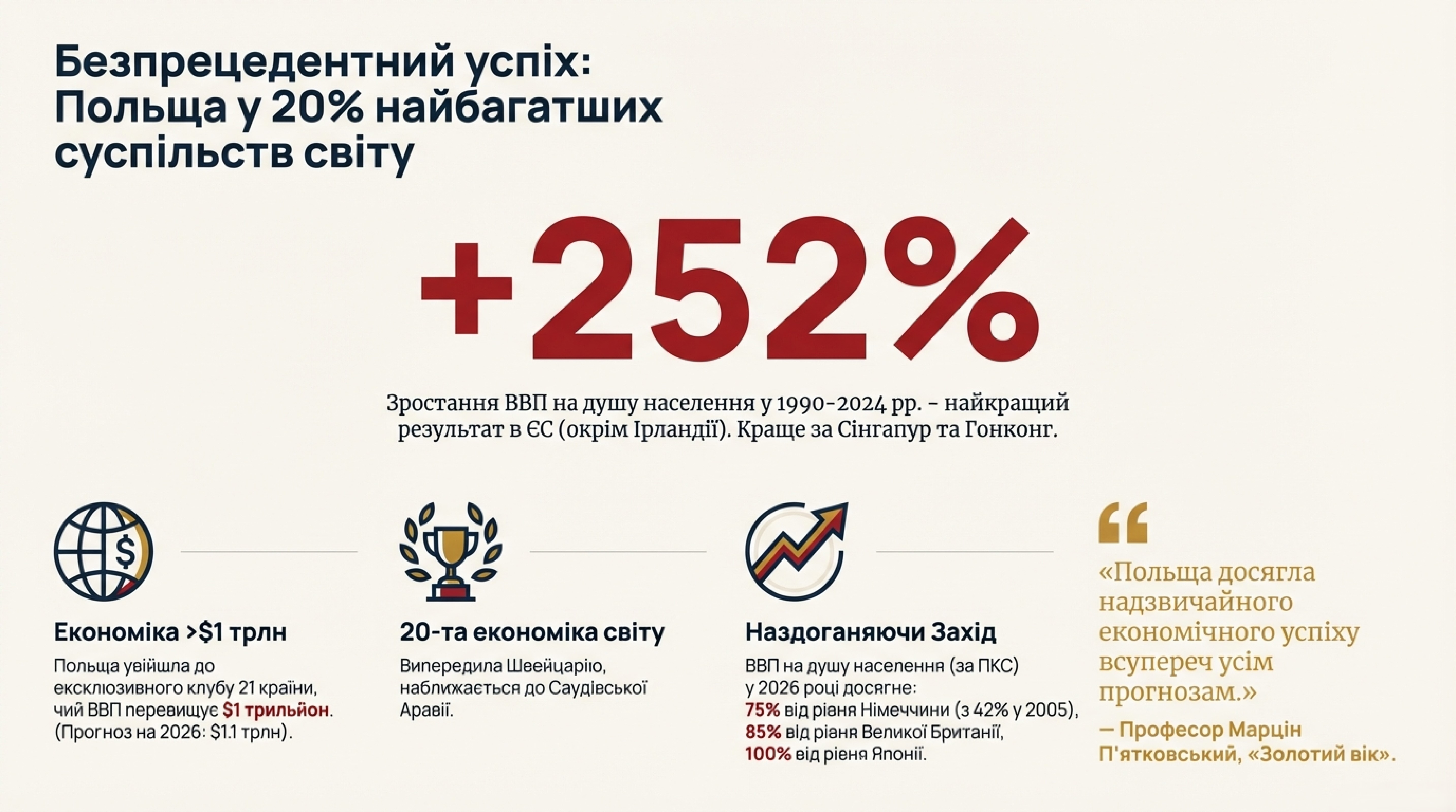 Феноменальний економічний успіх Польщі неможливо заперечити. За даними МВФ, ВВП країни перевищив 1 трильйон доларів, що вивело її на 20-те місце у світі. ВВП на душу населення стрімко наздоганяє західноєвропейські показники: якщо 2005 року він становив 42 % від німецького, то до 2026 року сягне 75 %, а також 85 % від британського і зрівняється з японським. З 1990 року зростання ВВП склало +252 % — це найкращий результат у ЄС (за винятком специфічного випадку Ірландії).