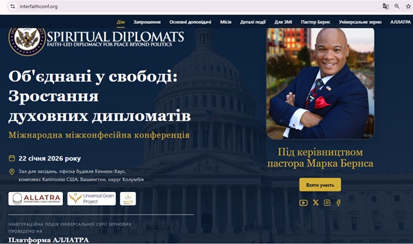 На платформі «АЛЛАТРА» під керівництвом пастора Марка Бернса відбулася Міжнародна міжрелігійна конференція: «Єдність у свободі: Час духовних дипломатів»: місцем проведення якої став Вашингтон, Капітолій.