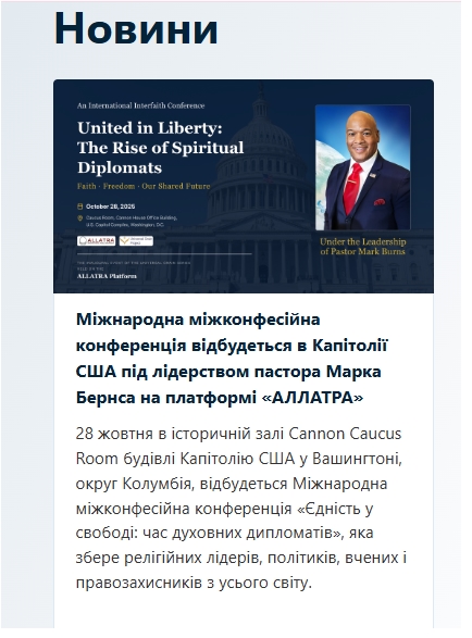 Пастор Бернс запросив усіх бажаючих взяти участь у Міжнародній міжрелігійній конференції «Єдність у свободі: час духовних дипломатів», яка відбудеться 28 жовтня в комплексі Капітолію США у Вашингтоні. Ця подія стане відкриттям серії конференцій на платформі АЛЛАТРА в рамках проекту «Єдине зерно» і об'єднає світових духовних і громадських лідерів, а також усіх, хто готовий внести свій вклад у побудову світу, заснованого на любові та правді.