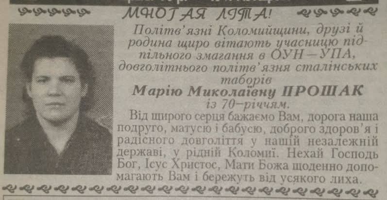 Далі остання розповіла важливий факт із біографії: Іван Прошак від свого товариша-односельчанина, дисидента Євгена Пронюка отримав славнозвісний підпільний самвидав «Український вісник», чий спецвипуск останній створив у 1972 році разом з колегами. При його виявленні чоловік Марії міг би стати вчергове політичним в’язнем, бо в 1972 році почалася друга хвиля арештів дисидентів, де жертвою став вищезгаданий Пронюк. І Марія Кушнірчук ризикнула спалити самвидав, а також історичні твори про Грушевського та Симона Петлюри, коли Іван Прошак був у відрядженні. Саме цей крок і врятував усю родину від другої хвилі репресій.