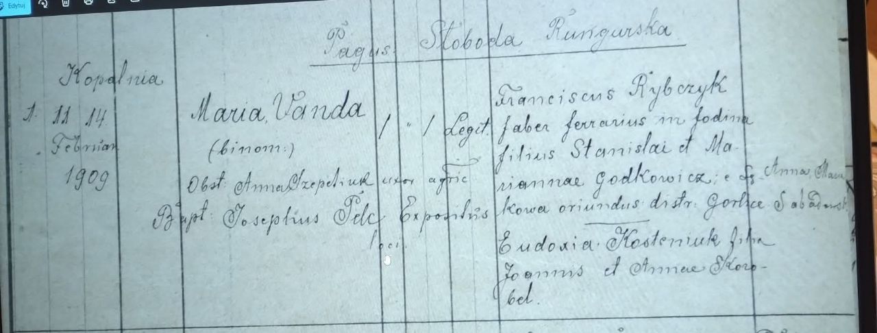 Марія Кушнірчук народилася 27 червня 1926 року в українському селі Молодятин. Про її батьків мені вдалося знайти багато інформації: мати, Марія-Ванда Францішковна Кушнірчук (з роду Рибчик), народилася 14 лютого 1909 року в селі Слобода-Рунгурська в польській родині Францішека Рибчика, коваля та сина Станіслава та Маріанни Годкович з Горлиці в Польщі, та Євдокії Костенюк, доньки Івана та Анни Коробель. Хрестив пані Ванду священик Йосиф Фельц – ці всі факти зазначені в метричній книжці, яку допомогли мені знайти представники польської коломийської діаспори. У матеріалах справи з НКВД вказані неправильні роки народження – 1907 та 1908 роки, хоча там ж і вказано було її достовірне місце народження.