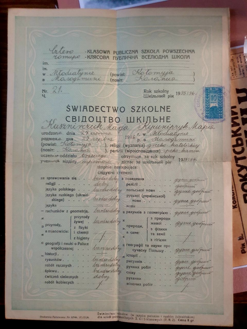 Ось у такій змішаній польсько-українській родині й зростала Марія Кушнірчук. У родинному архіві пані Олесі збереглися свідоцтва про закінчення навчального року від 1934-1935 до 1940-1941 років. Саме там підтвердилася дата її народження. У них можна побачити цікаву деталь: оцінки з української (руської) мови були відмінні («дуже добре»), лише в 1937-1938 навчальному році було «добре». Те саме було і впродовж двох років радянської окупації в 5-6 класах незважаючи на те, що польської не було вже й додалися російська та німецька мови. У більшості років навчання була «круглою» відмінницею, що засвідчило про високоосвіченість та розвинутий світогляд. Далі навчання в неї припинилося через німецьку окупацію.
