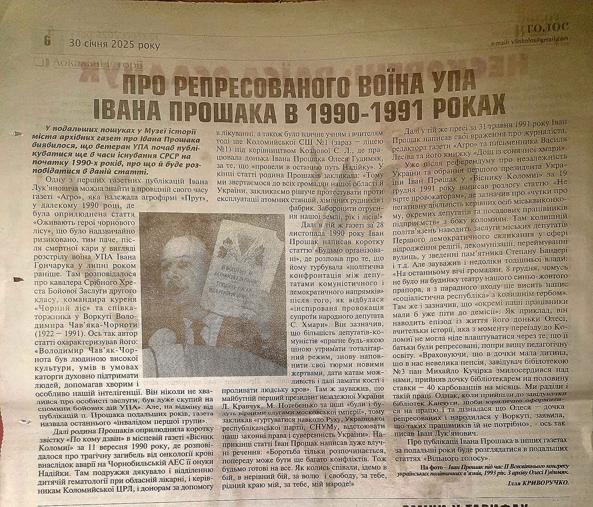 У подальших пошуках у Музеї історії міста Коломиї архівних газет про Івана Прошака виявилося, що ветеран УПА почав публікуватися ще в часи існування СРСР на початку 1990-х років, про що й буде розповідатися в даній статті.