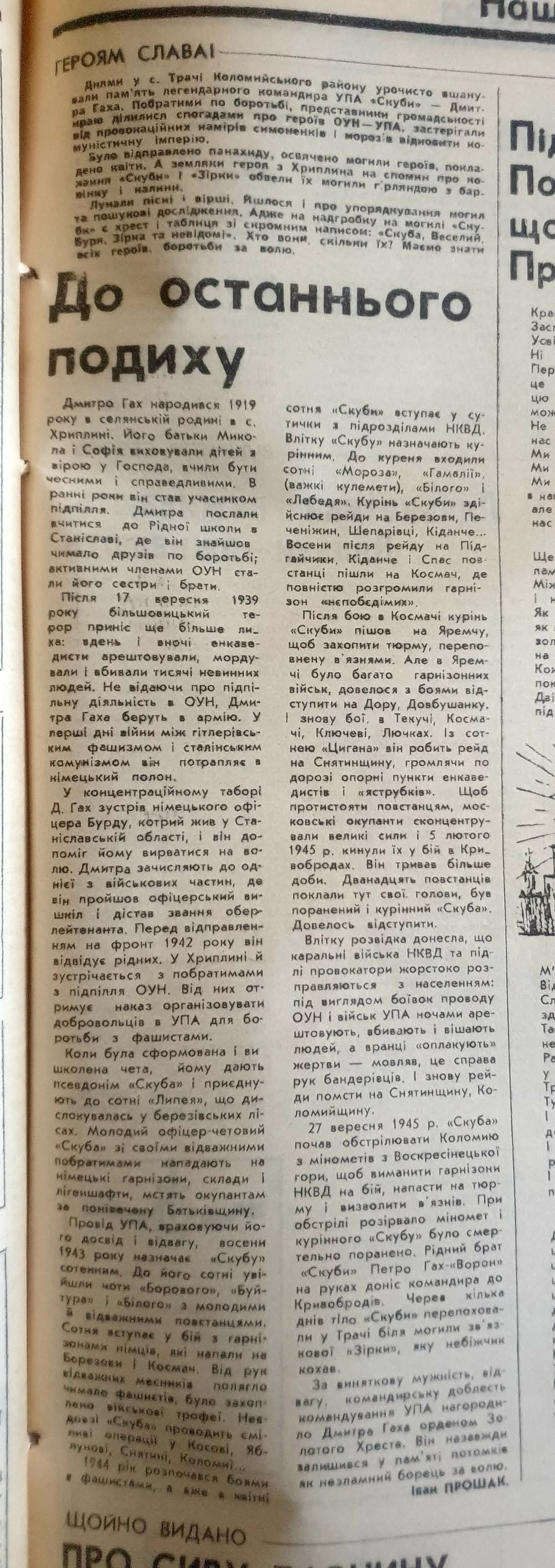 А в тій ж газеті за 14 жовтня (No. 151 (1110)) Іван Прошак розповів про те, що в селі Трач відбулася панахида за полеглим Дмитром Гахом "Скубою", про якого і написав розлогу біографію. Вона є на фото під статтею.